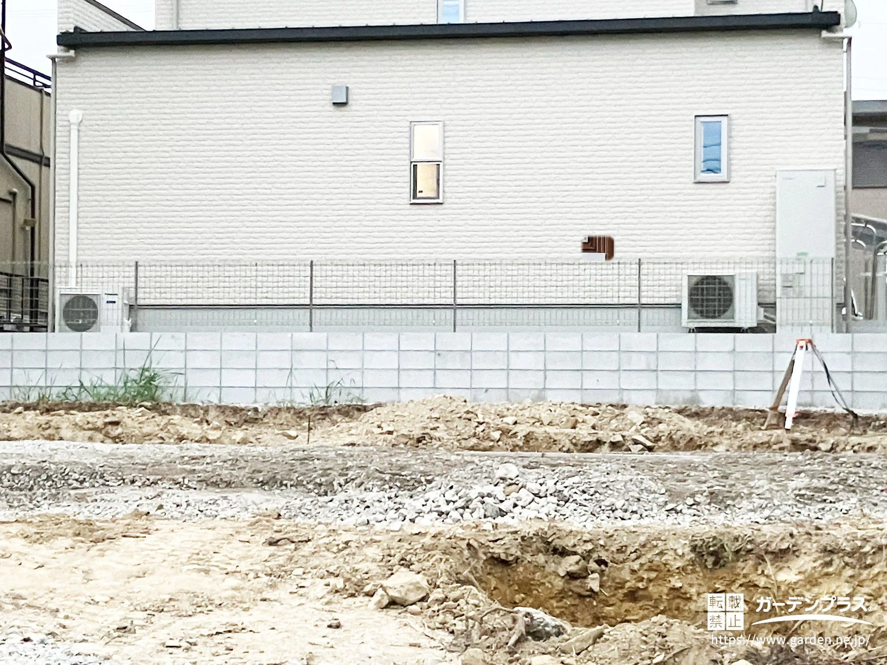 新築のお住まいの外構工事を承りました。駐車スペースは土間コンクリート仕上げで、2台分のカーポートを設置し雨や日差しから車を守ります。予備駐車スペースには防草シートと砂利を敷き、来客時も安心の駐車スペースとなりました。また、玄関前には木調デザインの機能門柱を設け、角柱スリットフェンスと組み合わせることで意匠性を高めています。さらに掃き出し窓前のフォーカルポイントとなり、外観のアクセントとしても効果的です。シンプルな構成ながら温かみのある新築外構が完成しました。
