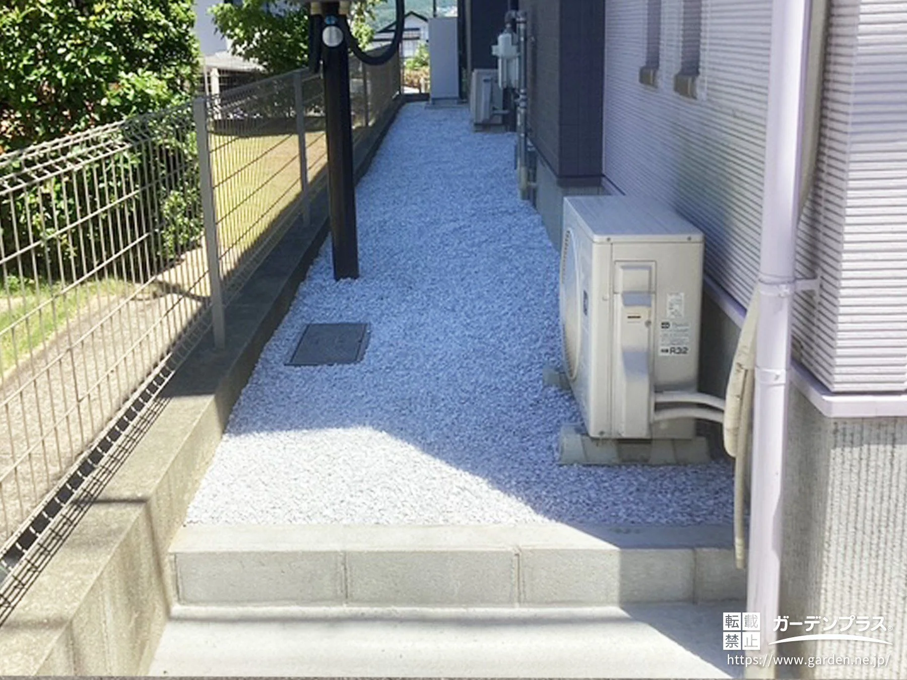 犬走りに防草シート砂利を敷設しました。砂利は白の石灰砂利をセレクトしているため、雑草対策ができるだけでなく明るい印象のお住まい周りに仕上がっています。
