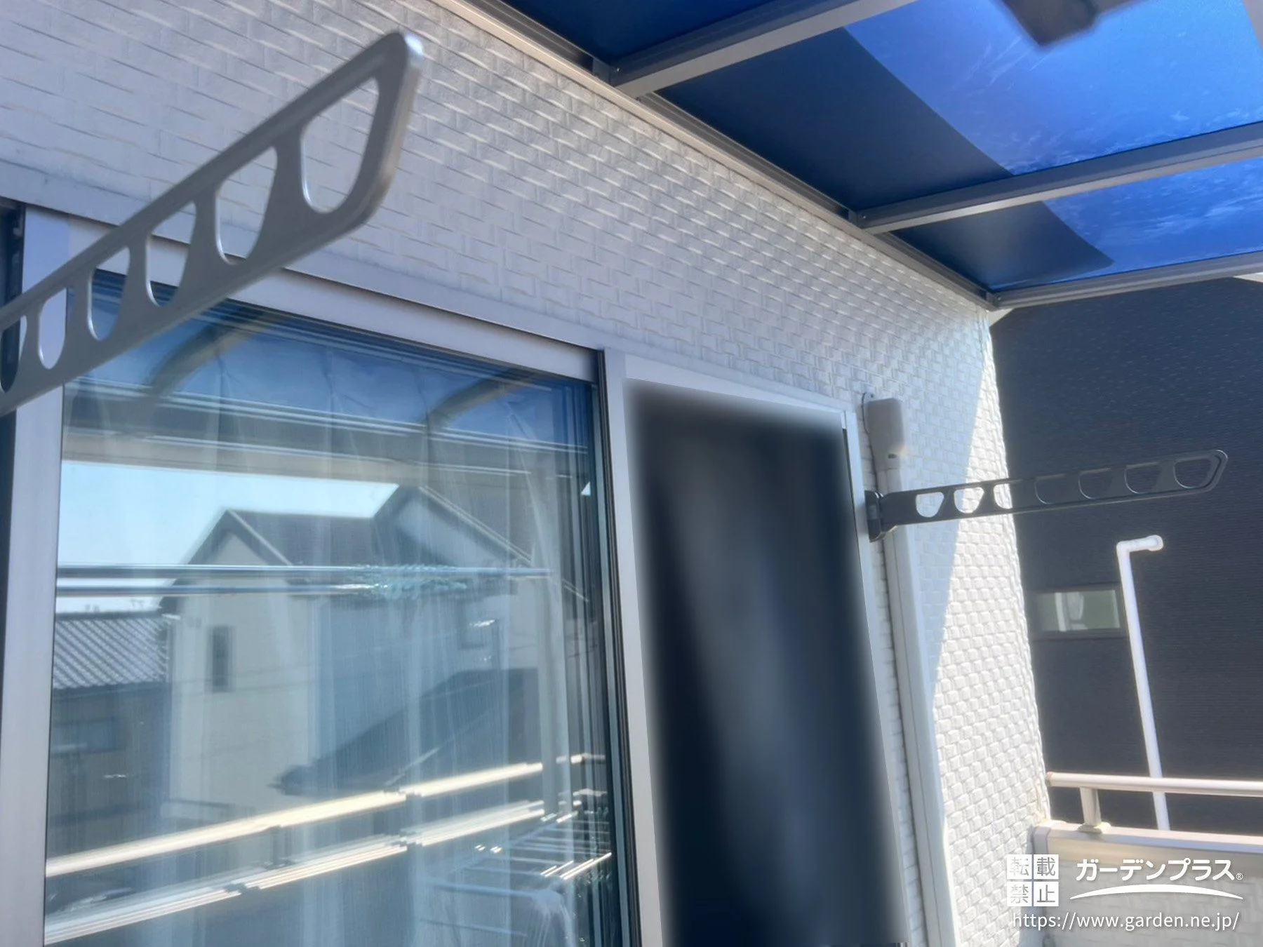 掃き出し窓前にテラス屋根を取り付けました。熱線遮断ポリカーボネート屋根を用いることで、夏場の室内の温度上昇の防止にも役立ちます。また、物干しを取り付けて雨の日も快適に家事ができる工夫をしました。