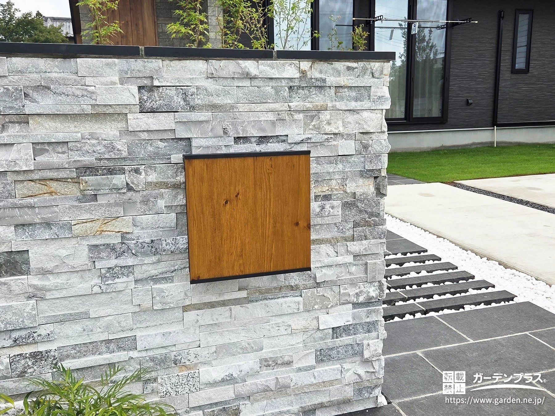 門柱と調和させた天然石張りのアプローチは、深みのあるブラックが印象的。白砂利とのコントラストが際立ち、まるで旅館の玄関を思わせるような落ち着きと上品さを漂わせます。少し角度をつけた動線が、視線を自然に奥へと導き、空間に広がりを演出。植栽の緑が差し色となり、季節ごとに変わる表情を楽しめます。日常が特別に感じられる、重厚で洗練されたアプローチです。