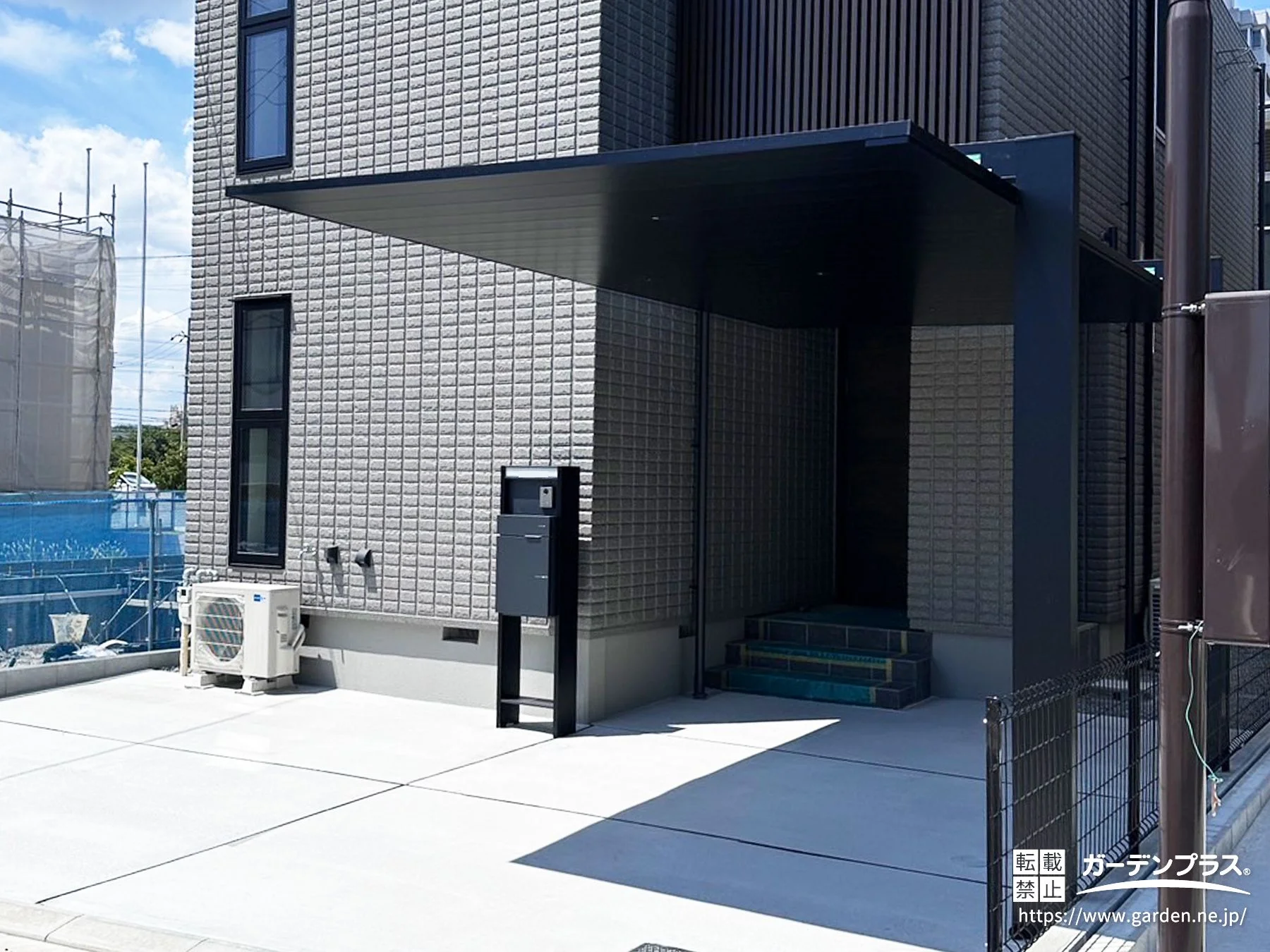建物のシャープなデザインに合わせ、全体をブラックで統一した洗練の外構プラン。アルミ屋根のカーポートがファサードに奥行きを与え、昼は建物の陰影を美しく際立たせ、夜はダウンライトの灯りが穏やかに迎えてくれます。宅配ボックス付きの機能門柱とも同系色でまとめ、スタイリッシュながらも実用的に。犬走りやフェンスまわりには防草シートと砂利を採用し、メンテナンスのしやすさにも配慮しました。シンプルで無駄のない構成が、住まいの存在感を一層引き立てます。