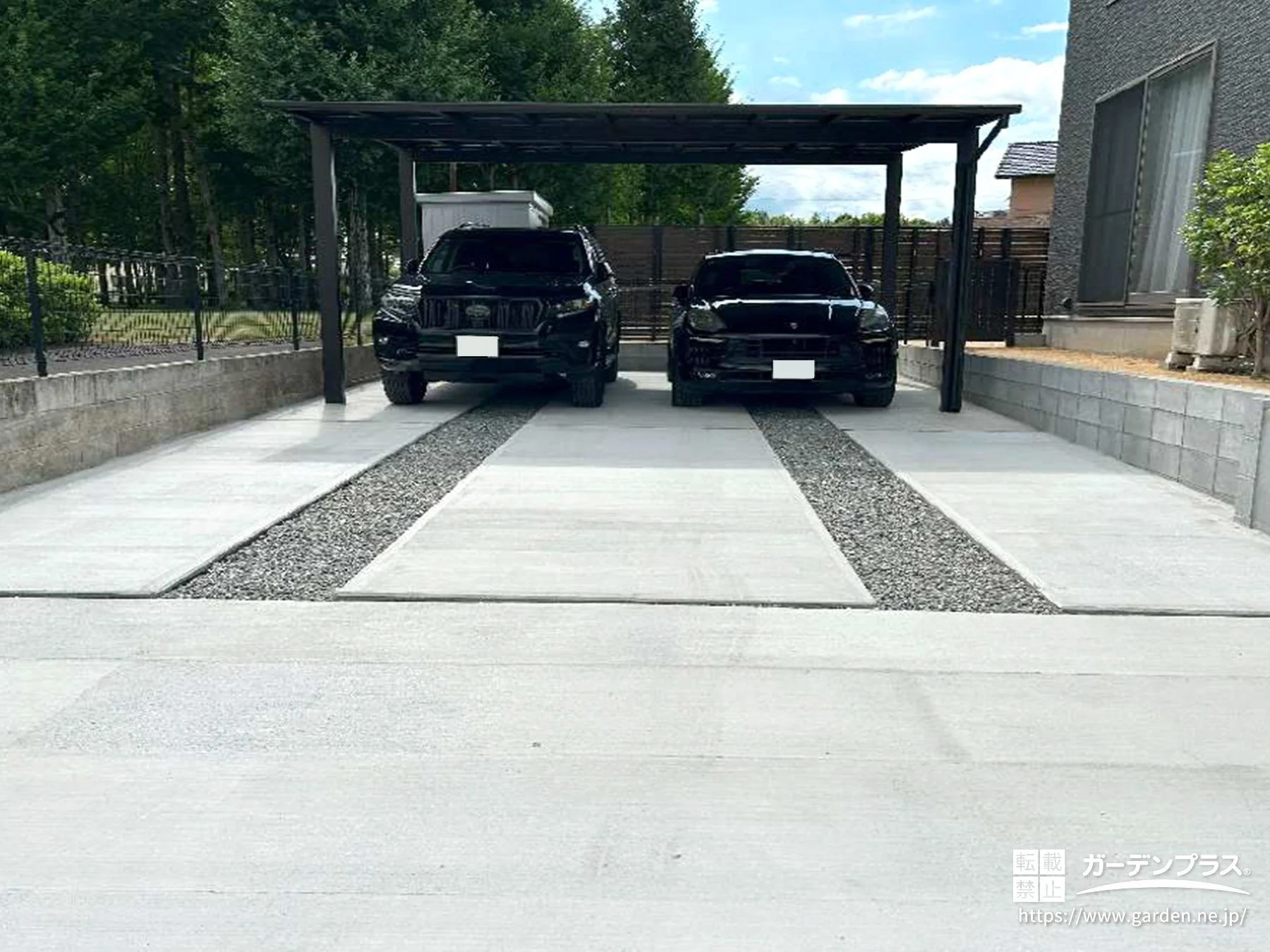 駐車スペース:土間コンクリート 刷毛引き仕上げ + スリット 防草シート + 砂利