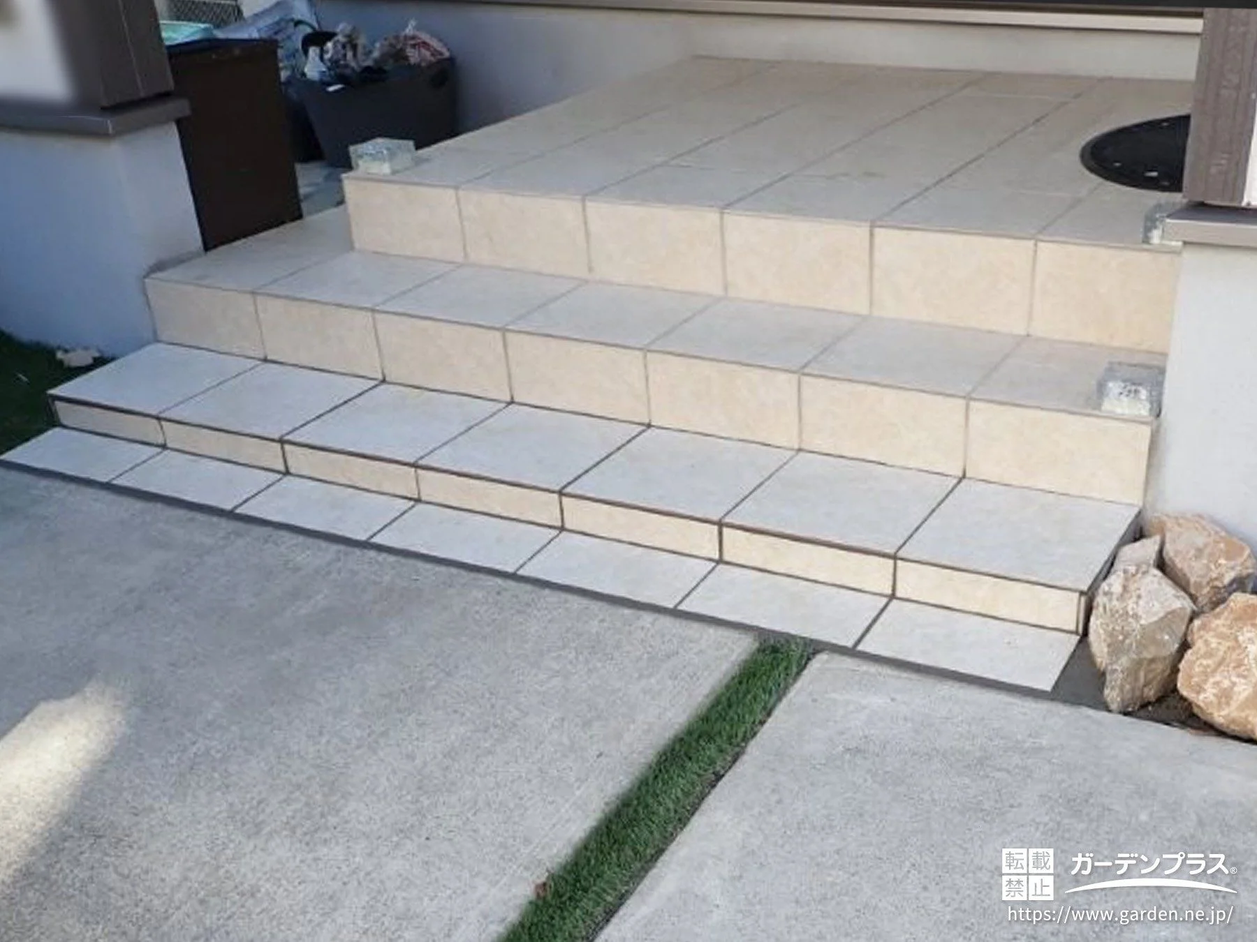 玄関ポーチ階段を1段増設し、タイルを貼りました。段差が軽減され、昇り降りが楽になっています。