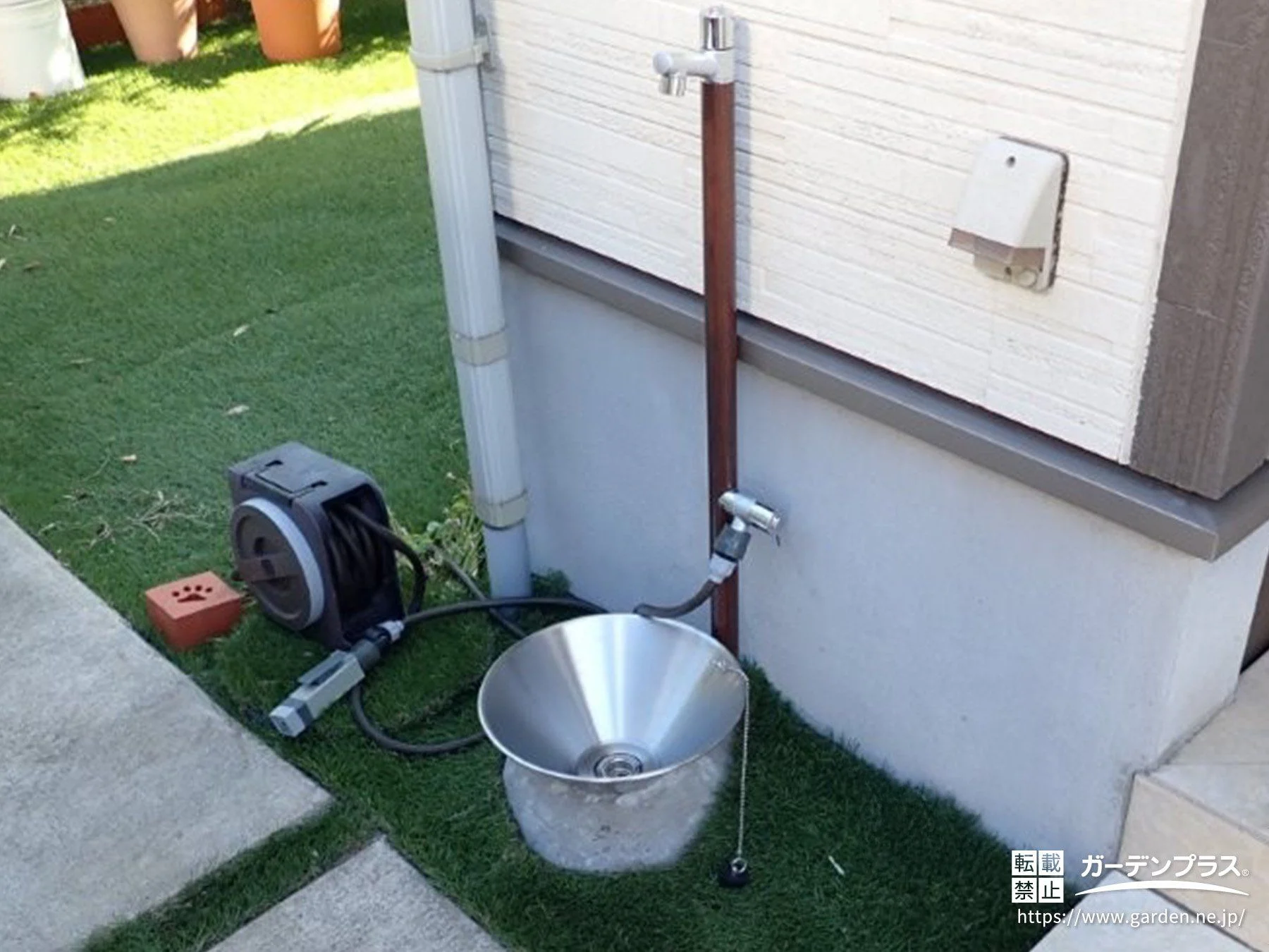 お庭の一画に立水栓を設置しました。可愛らしいデザインでお庭に馴染みつつ、手洗いや水やりに便利にお使いいただけます。