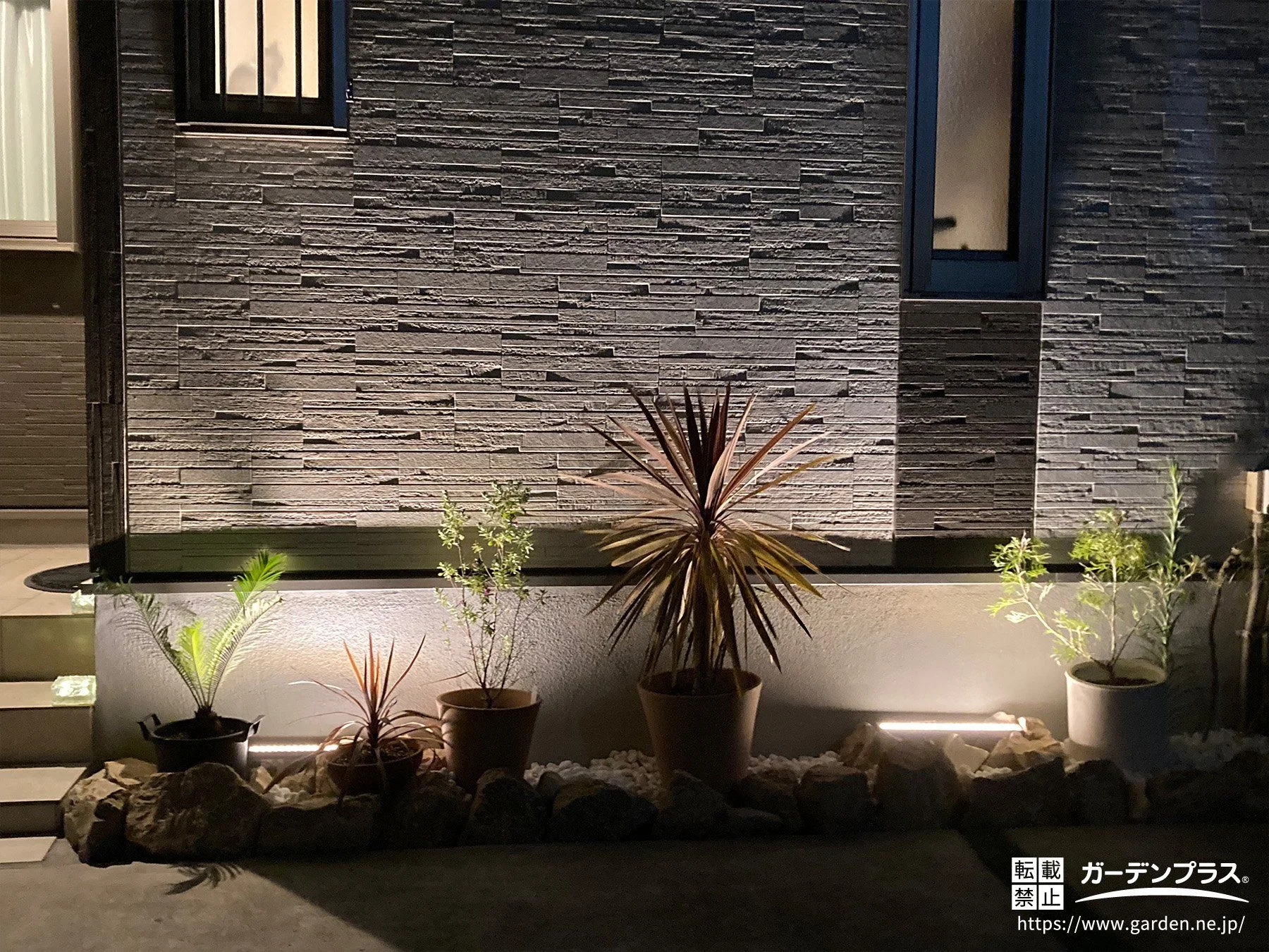 植栽スペースに自然石を配置し、ナチュラルな印象をプラスしました。ランダな石の表情が温かみを生み、昼間はナチュラルに、夜はライトアップによって幻想的な印象に変わります。階段も新たに増設し、タイル張りで安定感と上質さをプラス。さらに立水栓を設置し、日々の水まわり作業にも便利な空間に仕上げました。