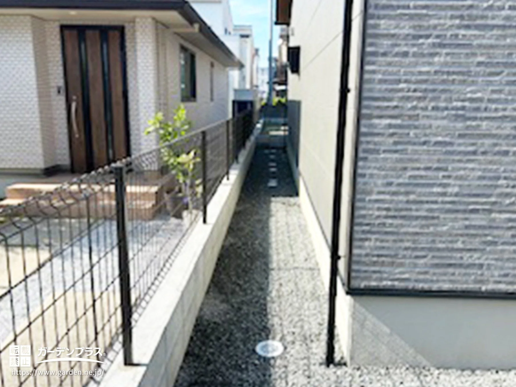建物まわりには防草シートと砂利を敷き込み、雑草の発生をしっかり抑えたメンテナンスフリーな仕上がりに。境界にはハイコストパフォーマンスのスチールメッシュフェンスを設置し、隣地との仕切りを保ちながら風通しも確保しました。シンプルながら清潔感のある外周スペースは、暮らしを快適に支える大切な外構ポイントです。
