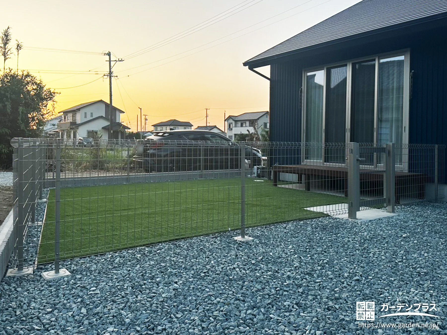 建物のデザインに合わせて、落ち着いた印象の門柱を設けました。ジョリパット仕上げのやわらかな質感に、木目調のポストがアクセントになり、シンプルながらも洗練された玄関まわりに。足元には割栗石を添え、立体感のある仕上がりにしています。お庭にはフェンスと門扉を設置してクローズ化し、安心して愛犬を遊ばせられるドッグラン仕様に。人工芝を敷いたスペースは、走ったり寝転んだりできる快適な空間となりました。