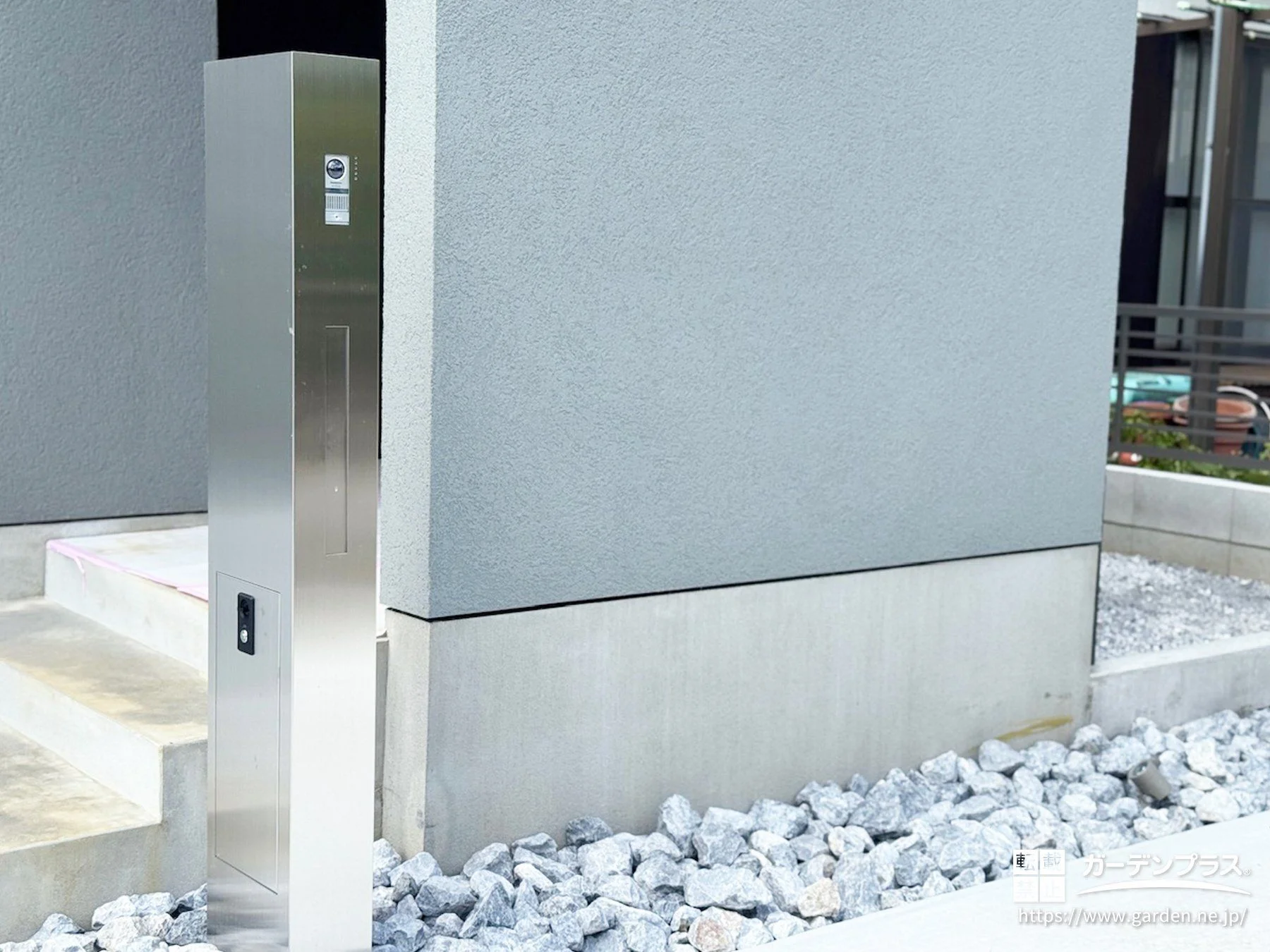 ステンレスの質感が際立つ、スタイリッシュな機能門柱