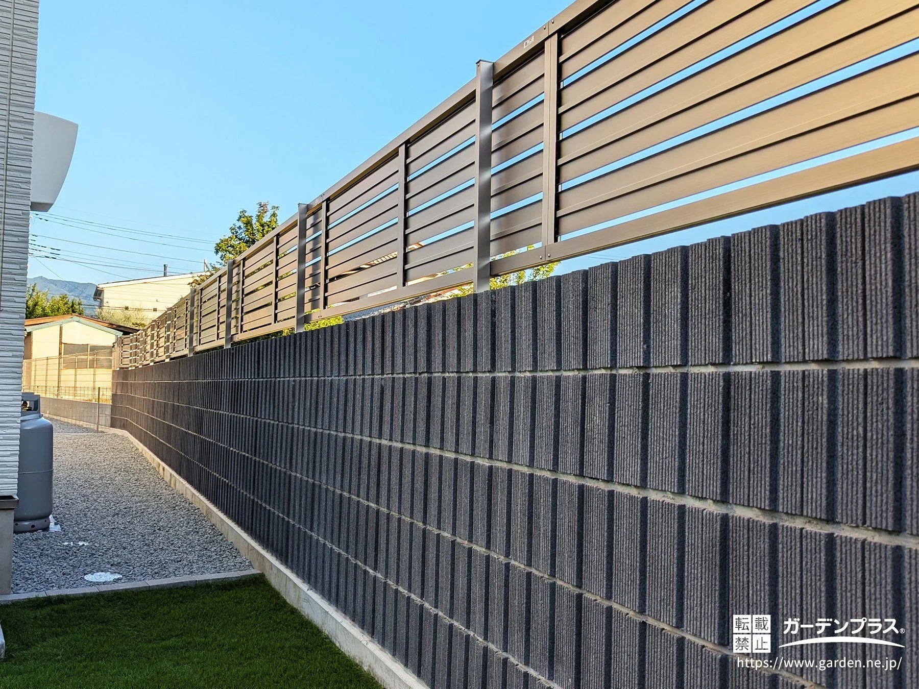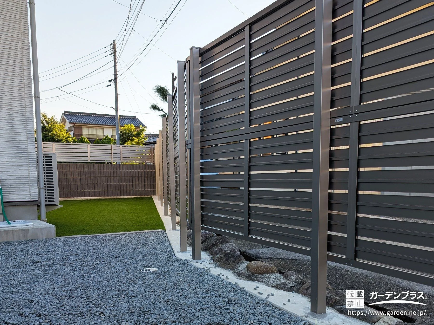 東側には多段柱を使用した目隠しフェンスを独立基礎で設置。しっかりとした高さでプライバシーを守りつつ、横格子のデザインが風と光を通して圧迫感を軽減します。シャイングレーの上品な色合いが建物外観と調和し、シンプルながらも洗練された印象に。お庭をプライベート空間として利用できるようになりました。