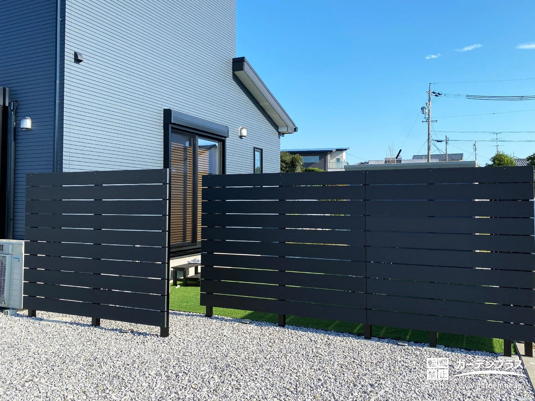 庭の前面に土新建材のエコモックフェンスを設置しました。板材の間に適度な隙間を設け、通風を確保しながら視線をしっかりカット。入り口部分を少しずらして重ねるように配置することで、完全に閉じすぎず、圧迫感を感じさせない半目隠し仕様としました。木調のやわらかな質感とマットなブラックカラーが、外観に落ち着きを添えつつ、庭での時間をより快適にしてくれるデザインです。