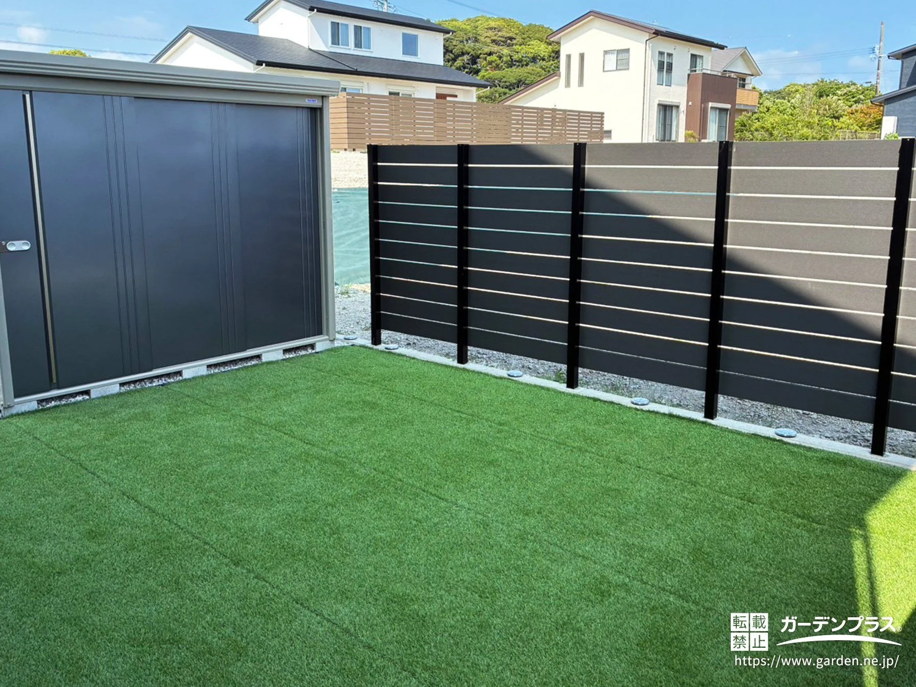 主庭の整地を行い、お客様ご自身で人工芝をDIYされました。均一に整った下地が美しい仕上がりを支え、芝の緑がより鮮やかに引き立ちます。フェンスと物置でしっかりと囲まれた空間は、周囲を気にせずお子様やペットと過ごせるプライベートな庭が完成しました。