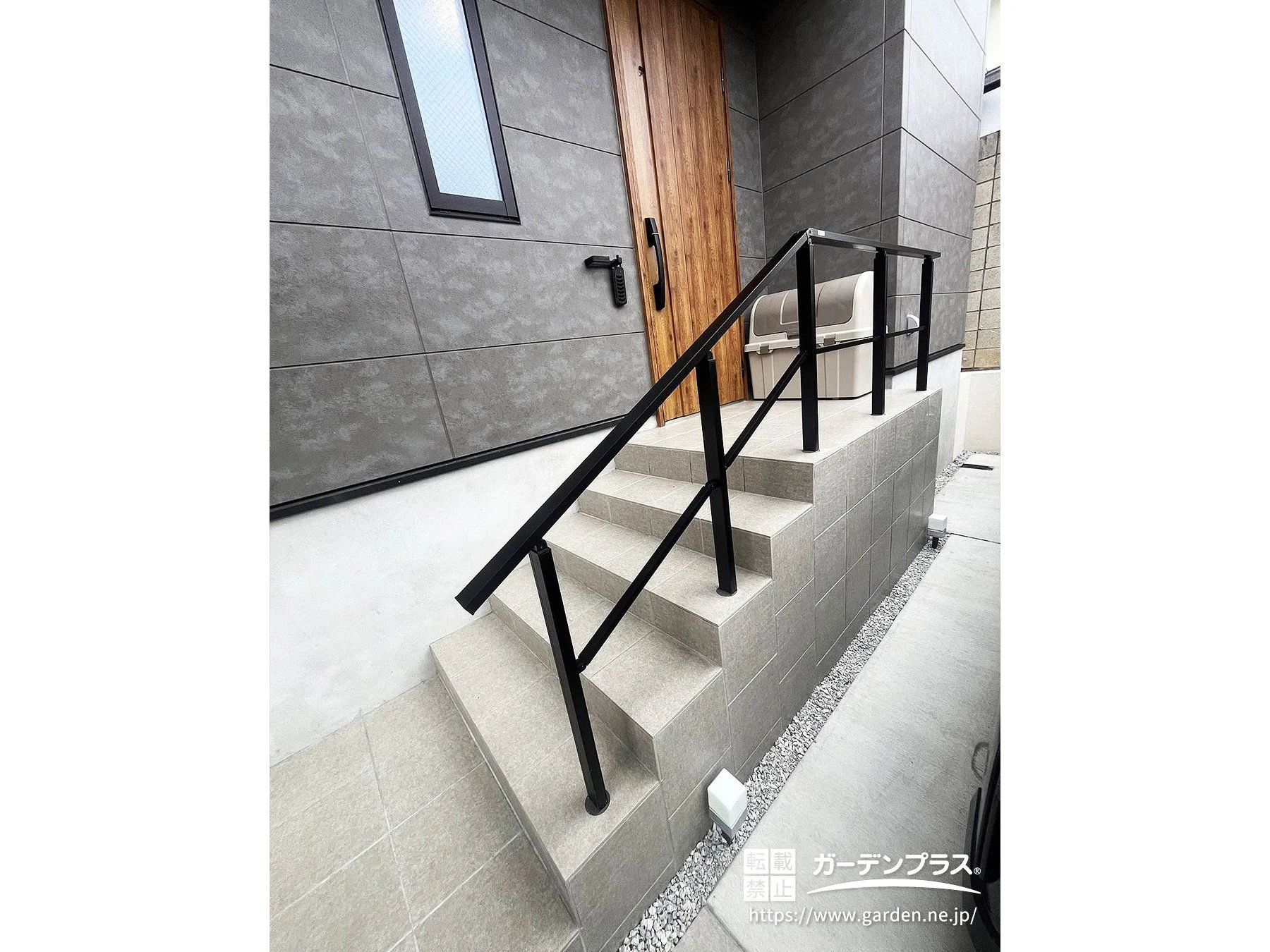 限られた敷地の中に、駐車・駐輪・アプローチを無駄なくレイアウト。建物の重厚感に合わせたブラック基調でまとめ、全体に統一感を持たせています。玄関前には屋根付きの駐輪スペースを設け、雨の日も安心。手すりや照明を組み合わせることで、安全性もプラスしました。さらに、奥にはプライベート感のあるタイルテラスを配置し、日常に心地よい外空間をプラスした設計です。