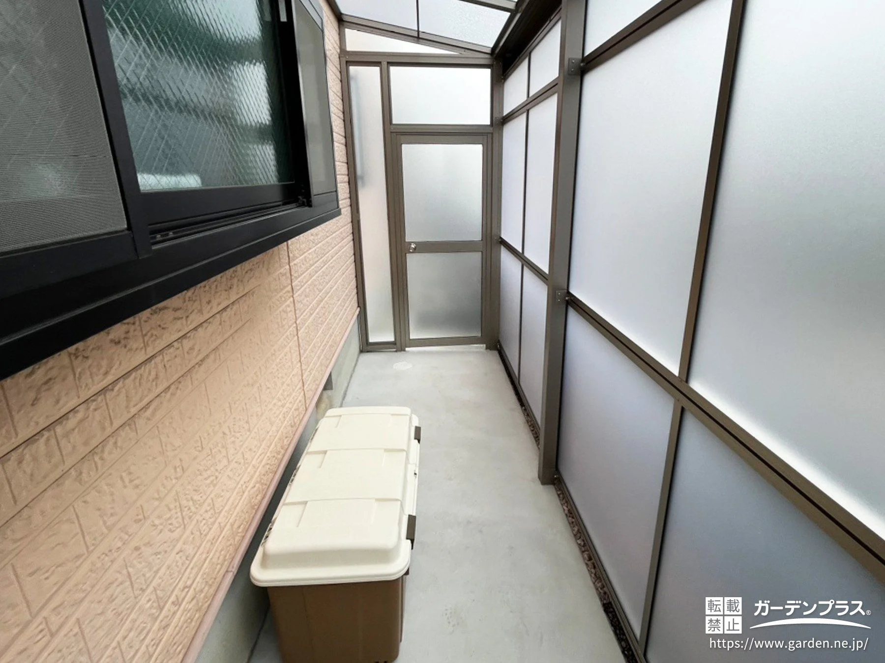 犬走りにストックヤードを取り付けました。雨に濡れずに洗濯物干しをできます。一時的なごみ置き場や、作業スペースとしても便利にお使いいただけます。