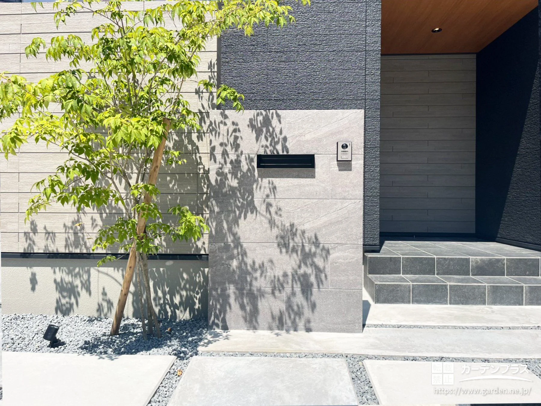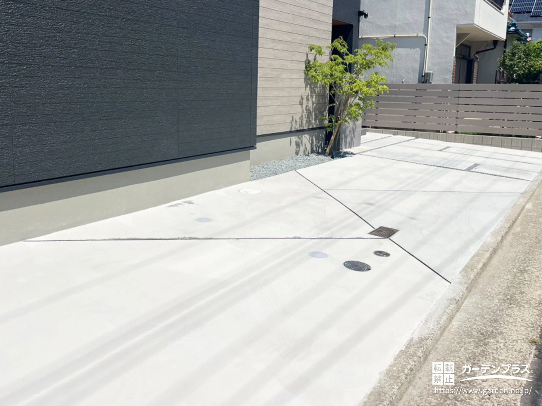 モノトーンの外観に合わせ、全体を直線的に構成したシンプルモダンな外構です。駐車スペースとアプローチは土間コンクリートで統一し、目地のデザインを変えることで奥行きとリズムを演出。天然石調タイルの門柱が住まいの印象を引き締め、アオダモの柔らかな緑がモダンな空間にやさしさを添えます。門柱の裏には門扉を設け、扉を開けるとプライベート感のある中庭が広がります。中庭にはお手入れがしやすいタイルデッキを施工し、家族がくつろぎ、子どもがのびのび遊べる憩いの場に。シンプルながらも心地よさと上質さが調和したシンプルモダンな外構が完成しました。