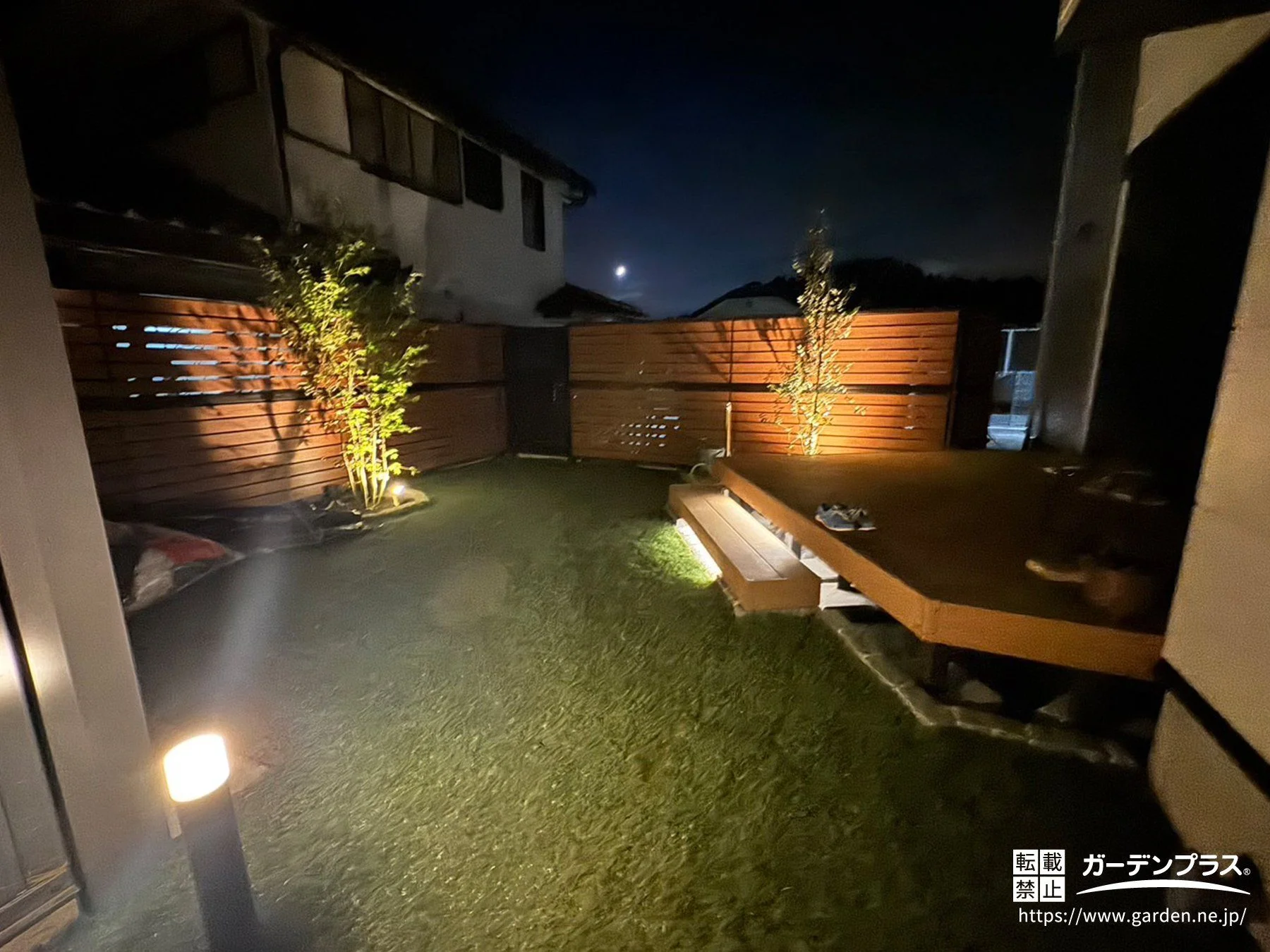 夜の庭を心地よい光で包みました。フェンス越しに漏れるやわらかな明かりが、植栽やウッドデッキの陰影を美しく浮かび上がらせ、昼間とは違う上質な表情を見せます。デッキに腰かけて一日の終わりを過ごしたり、家族で星を眺めたりと、自然と外に出たくなる雰囲気に。やさしい光の演出が、プライベートな時間をより豊かに彩ってくれます。