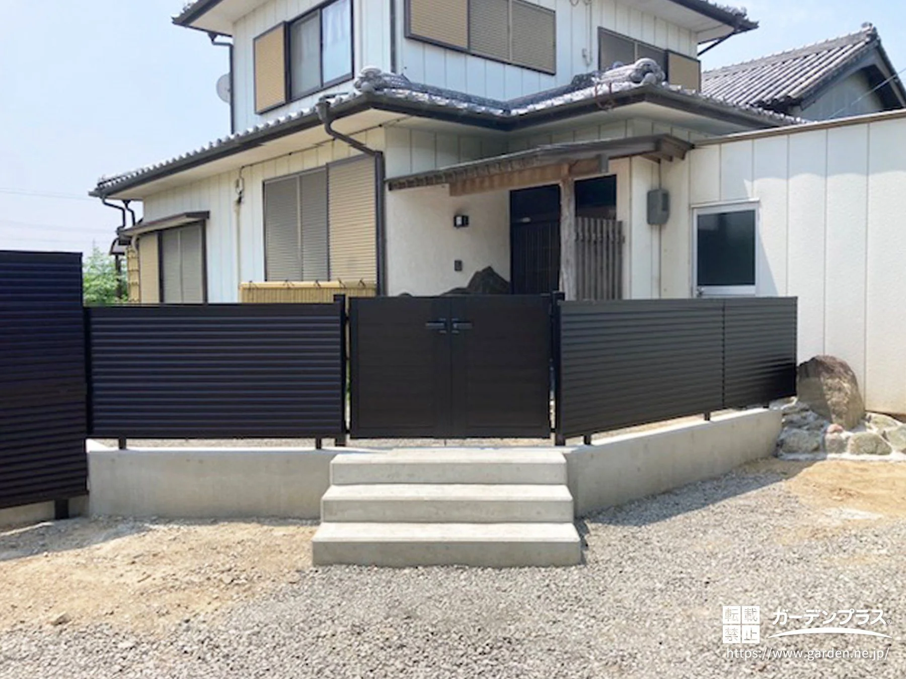 中古住宅をご購入されたお住まいを、プライバシーを重視したセミクローズ外構へリフォームしました。外周には目隠しフェンスを設置し、外からの視線をしっかりと遮る落ち着いたプライベート空間に。玄関へ続く階段はモルタル仕上げでシンプルにまとめ、すっきりとした印象を演出しています。庭は防草シートと砂利敷きで手入れの手間を減らし、将来的に人工芝を敷けるよう整地済み。ブラックを基調としたデザインが住まい全体を引き締め、安心して過ごせる心地よいセミクローズ外構が完成しました。