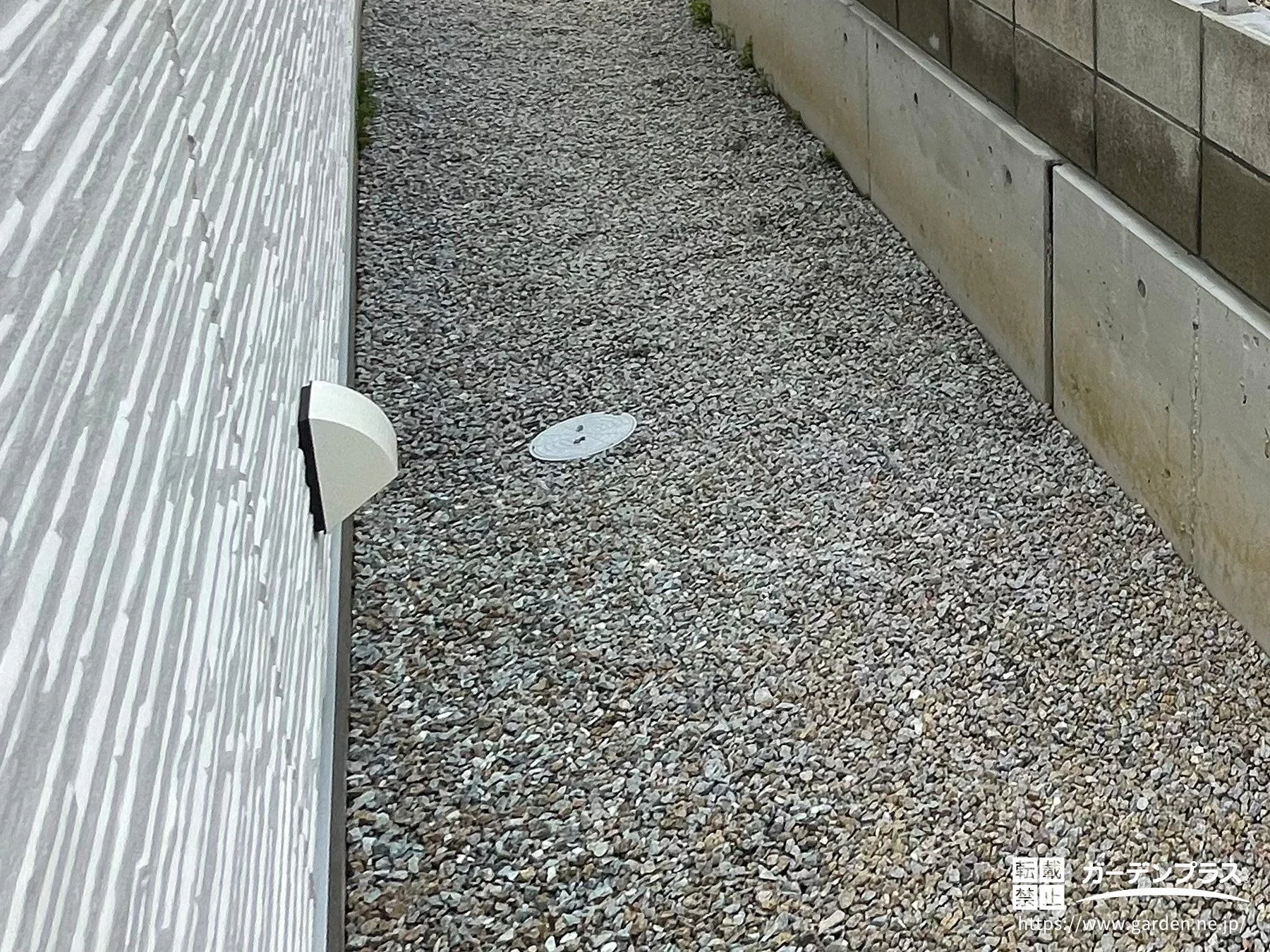 犬走りに防草シートと砂利を敷設しました。雑草が生えにくく、日々のお手入れが楽になります。