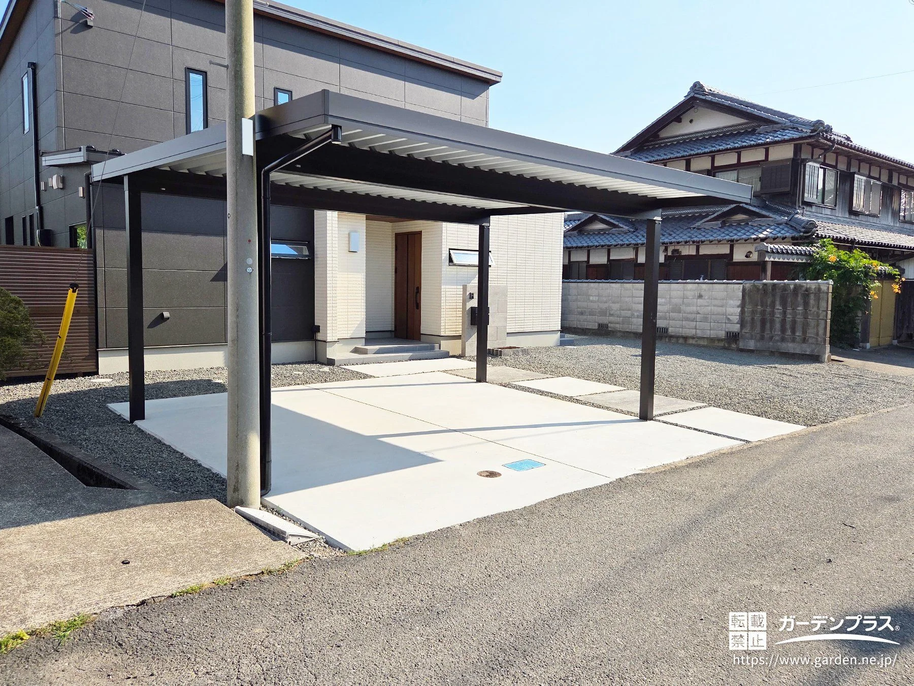 シンプルなモノトーンの外観に合わせ、駐車スペースからアプローチまでを無駄のない動線でまとめた外構プランです。シャープな印象の折板屋根カーポートを設け、2台分の駐車スペースをゆとりをもって確保。アプローチはコンクリートの刷毛引きと洗い出しを組み合わせ、質感の対比で空間に奥行きを感じさせる仕上がりに。門柱にはグレー系タイルをあしらい、シックながらも重くなりすぎない落ち着いた雰囲気を演出しました。シンプルながら計算されたアプローチデザインが際立ち、デザイン性と手入れのしやすさを兼ね備えた外構プランです。