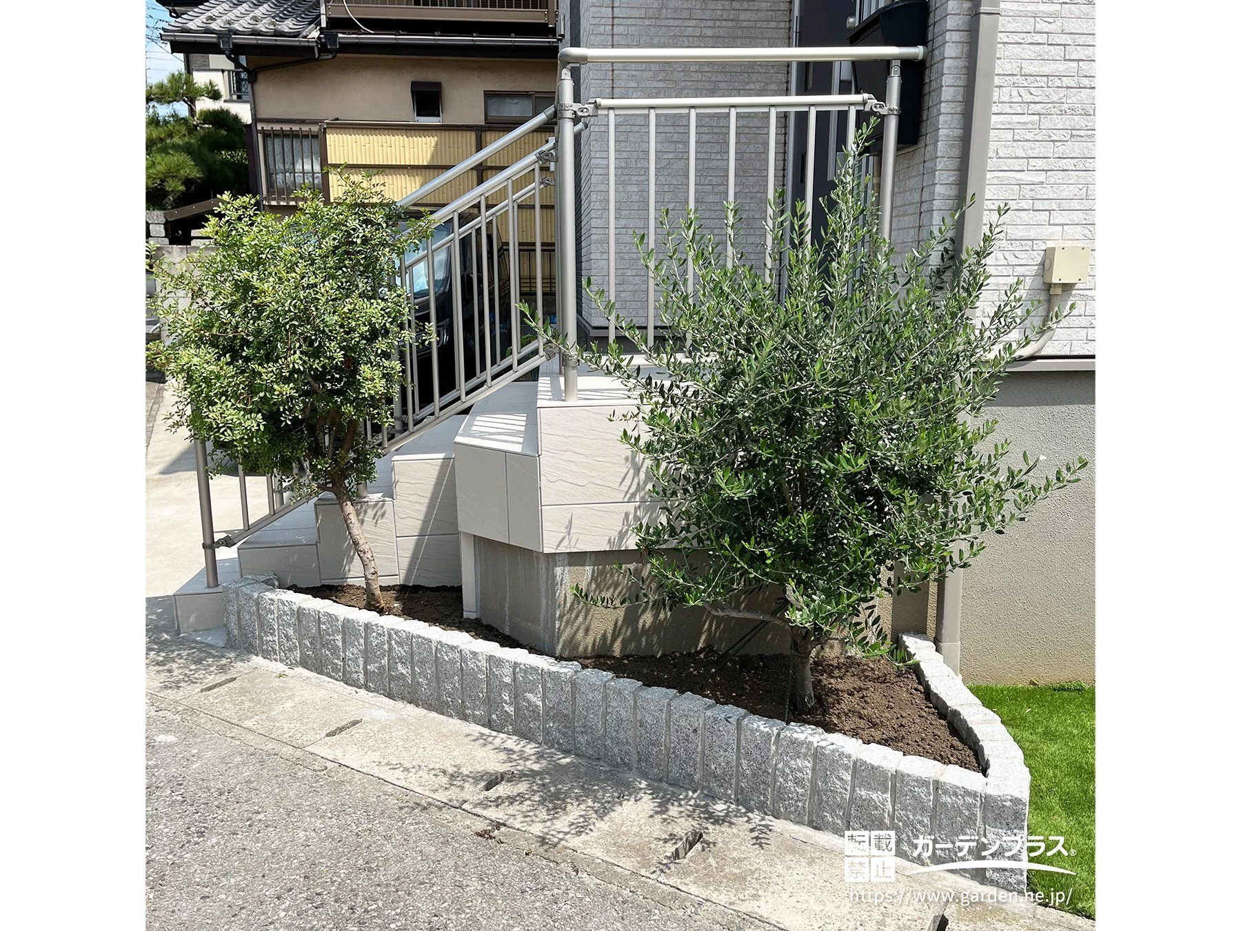 ひび割れが見られた玄関ポーチのタイル補修とあわせて、手すりを新しいデザインへとリフォームしました。既存の印象を崩さないよう、建物外観に馴染むプラチナステンの手すりを採用。縦格子デザインが軽やかさを添え、上品で統一感のある玄関まわりに仕上げました。タイルは明るいホワイト系で張り替え、足元の清潔感と開放感を演出。安全性を高めつつ見た目にも美しいアプローチのリフォーム工事です。周囲にはピンコロ石の花壇とオリーブの植栽を組み合わせ、やさしい印象のエントランス空間が完成しました。
