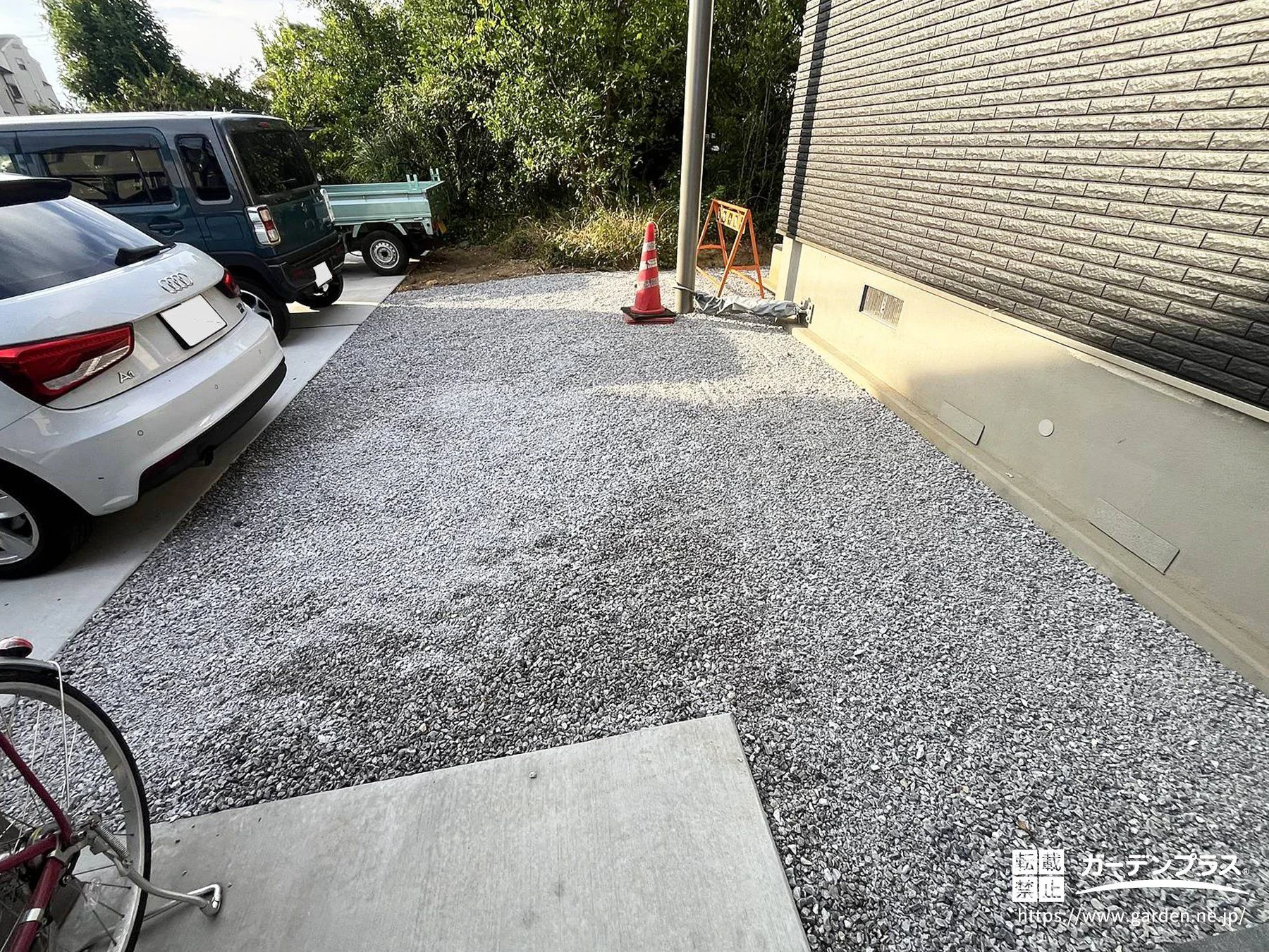 駐車スペース:土間コンクリート 刷毛引き仕上げ + スリット 砂利