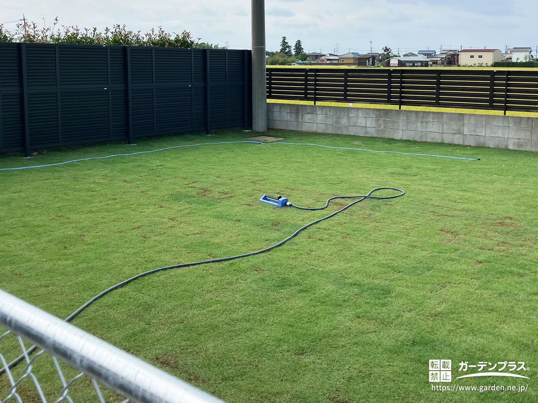お庭を天然芝のドッグランとして整備しました。フェンスブロックは既存のものを活かし、隣地境界には目隠しフェンスを設置して、安心して過ごせるプライベート空間に。芝には高品質な「TM9(ティーエムナイン)」を採用。一般的な高麗芝に比べて生長がゆるやかで、芝刈りや手入れの手間を大幅に軽減できるのが特長です。やわらかく密度のある葉が足に心地よく、ペットやお子さまにも優しい質感。季節ごとに色合いを変える天然の表情を楽しみながら、自然の中でのびのびと過ごせるドッグランに仕上がりました。
