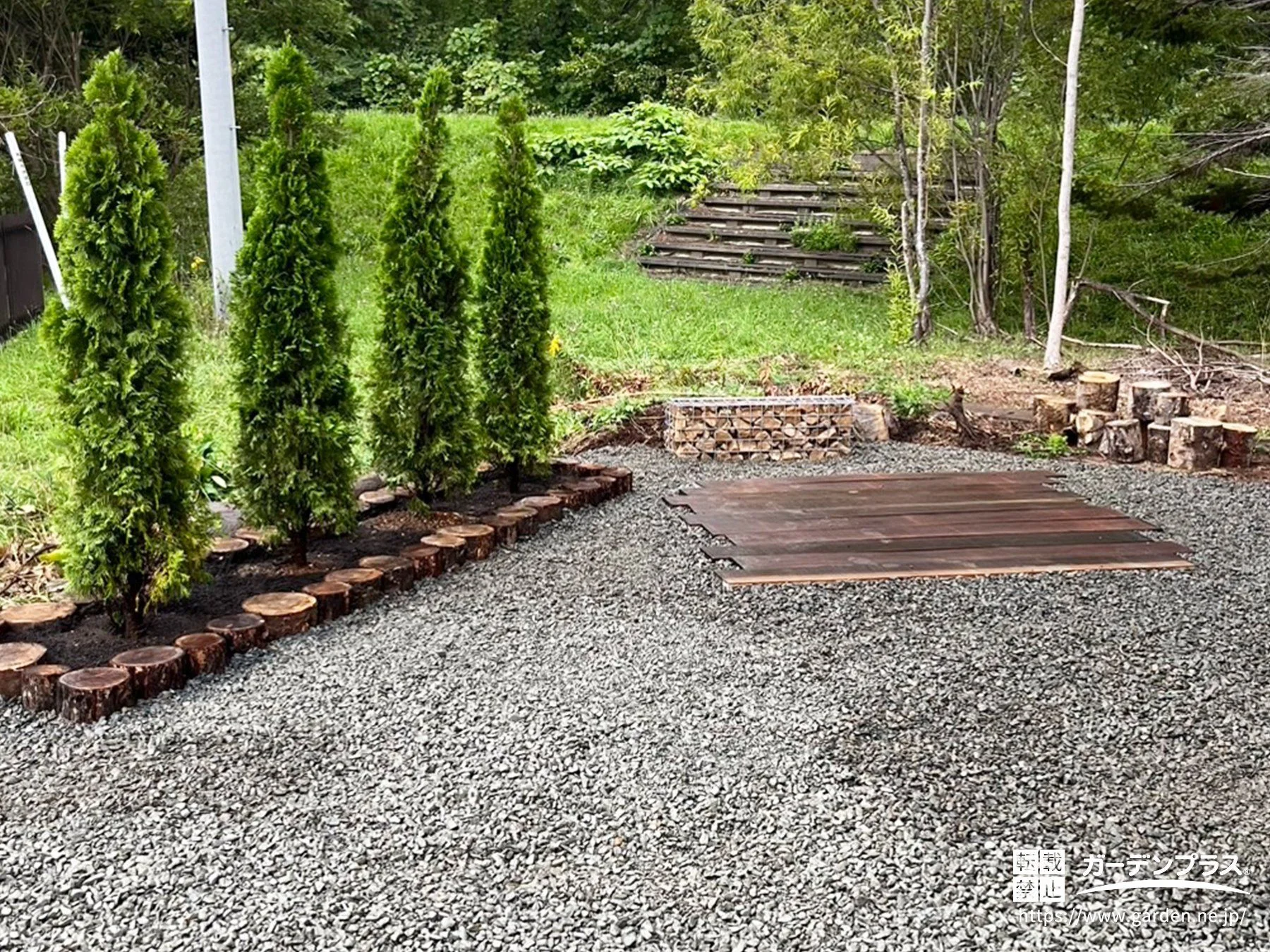 庭の一角には、伐採した切り株を再利用して花壇をデザイン。木の質感がやわらかな境界をつくり、植栽スペースに自然なアクセントを添えています。隣にはコンクリート枕木を敷いた作業スペースを設け、メンテナンスやガーデニングを気軽に楽しめる場所に。素材感の異なるガビオンやコニファーとも調和し、自然と暮らしが寄り添う温もりのある庭が完成しました。