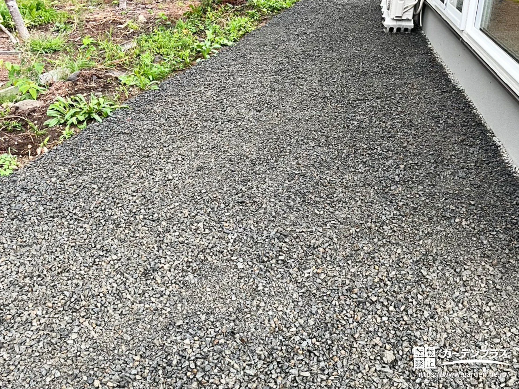 駐車スペースは転圧仕上げで安定感があり、雨の日も水はけがよく快適に使えます。建物まわりや犬走りには防草シートと砂利を敷設し、雑草の発生を抑えつつすっきりとした印象に。自然に囲まれた環境の中でも、日々の手入れがしやすく、清潔感を保てる建物周りです。