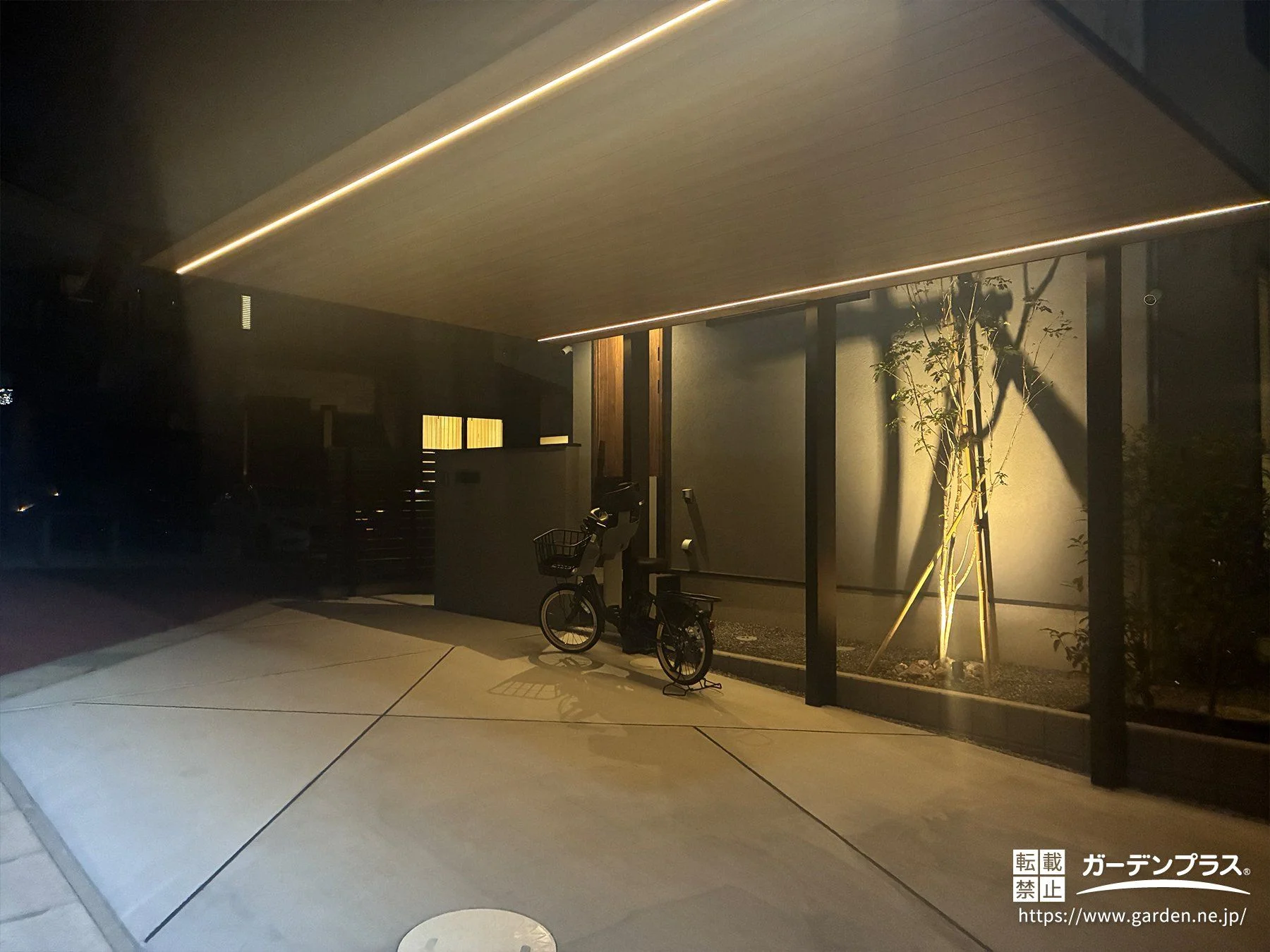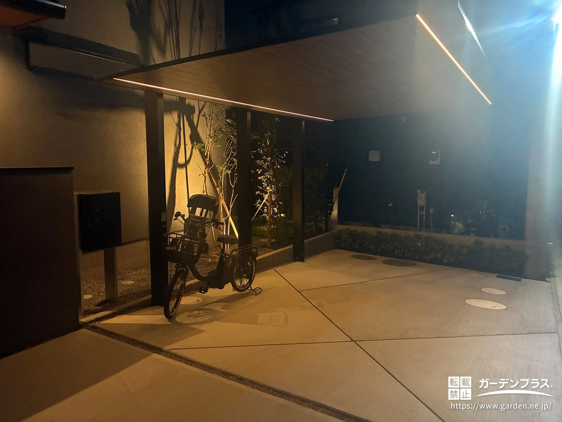 カーポートの屋根ラインに溶け込むように設置された「シームレスライト」が、夜の外構を上質に演出します。光源の粒を感じさせない滑らかな光が、車の出入りを安全にサポートしつつ、防犯性も向上。やさしく広がる光が壁面や植栽を美しく照らし、昼間とは異なる表情を楽しめる外構の照明設計です。