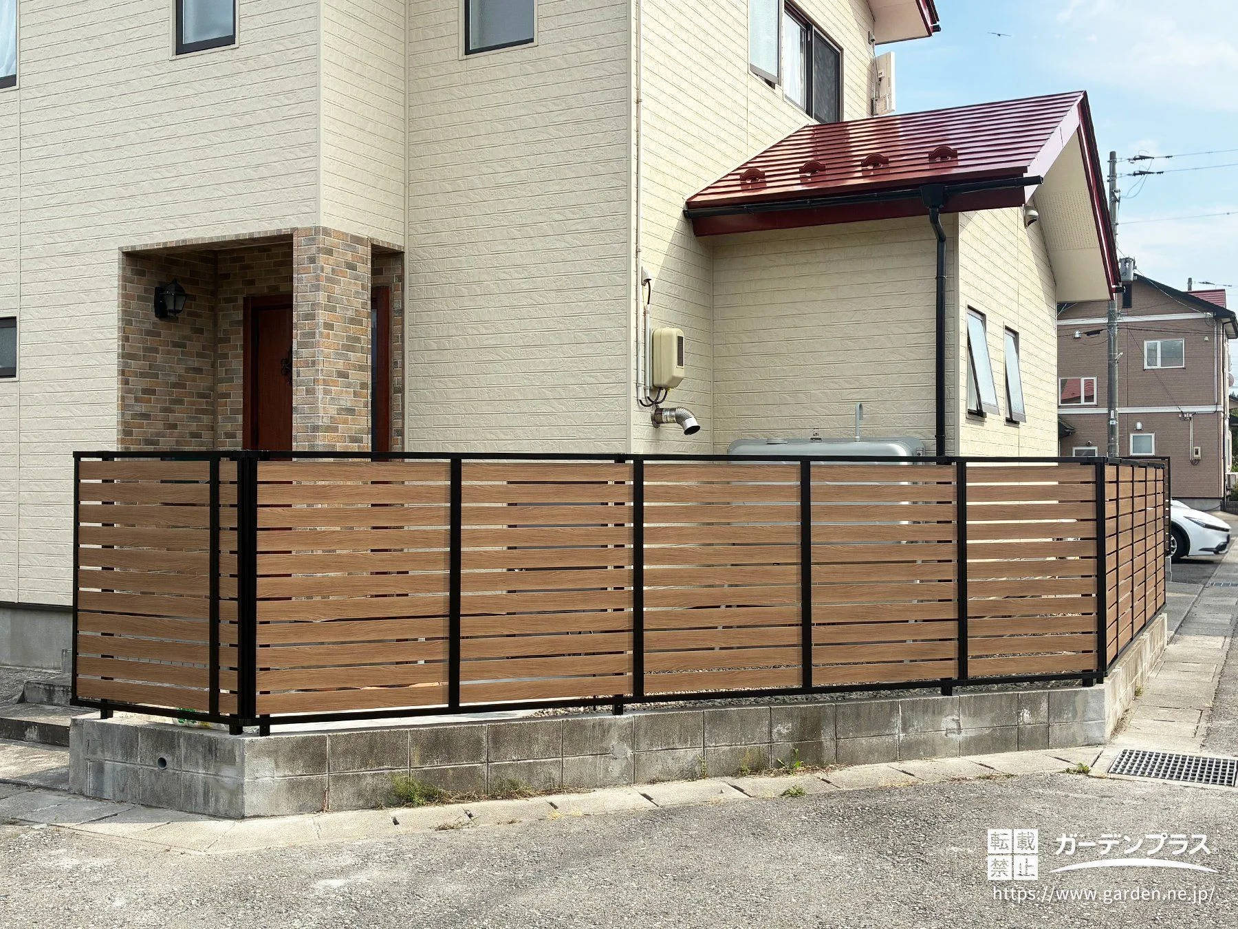 ナチュラルな雰囲気の建物にフィットする木目調の目隠しフェンス
