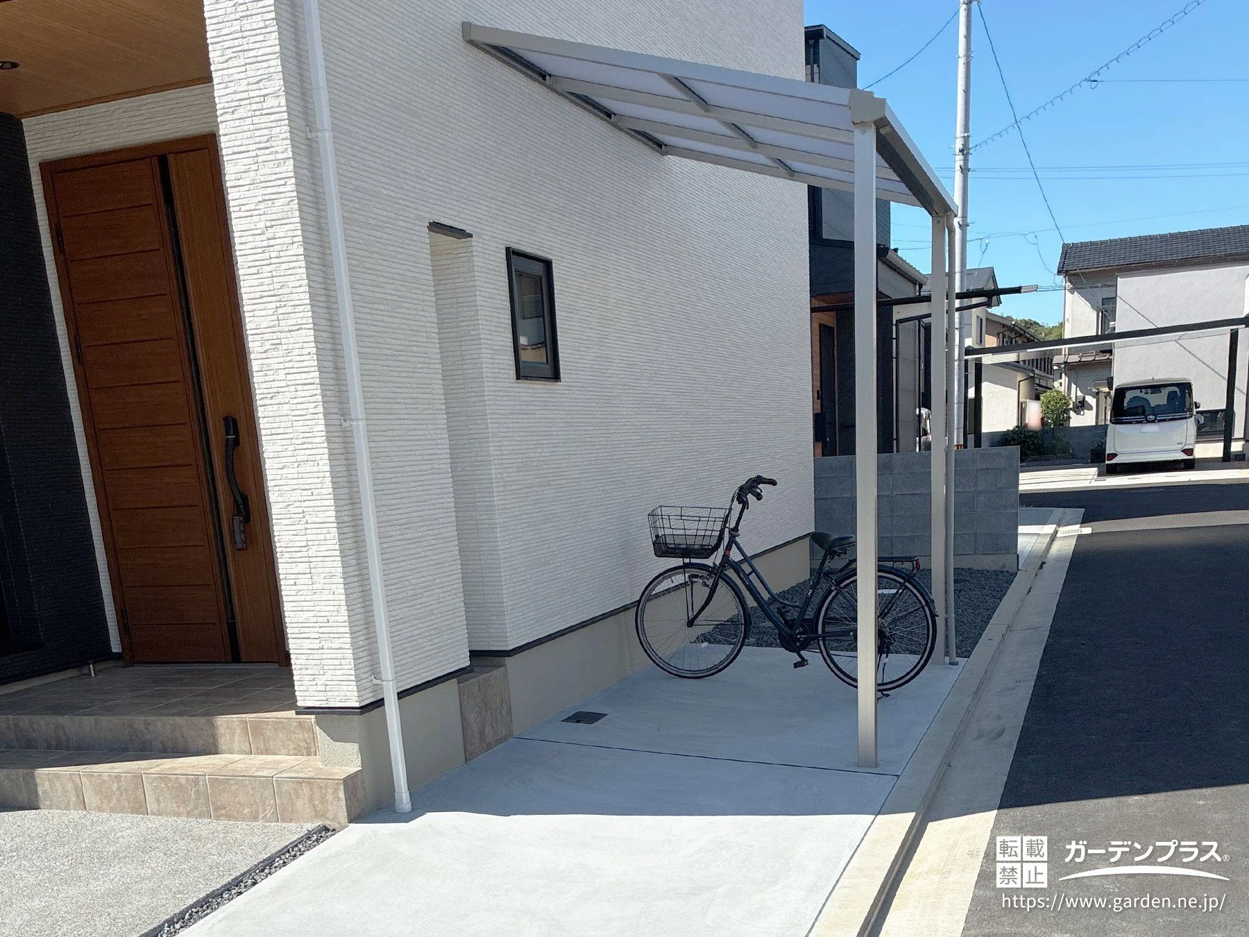 新築外構一式をトータルでプランニングしました。建物のモノトーン外観に合わせ、全体を直線的で洗練されたデザインに統一。駐車スペースは金鏝仕上げの土間コンクリートで清潔感を演出し、カーポートとサイクルポートを設けて実用性を高めています。アプローチにはパールピンクの天然石を採用し、上品でやわらかな雰囲気をプラス。淡いピンクが華美になりすぎず、上質なアクセントとなっています。さらに、カーポートやサイクルポートには弊社姉妹店「エクスショップ」ブランドのValue Selectシリーズを採用し、品質を保ちながらコストをスマートに抑えることができました。無駄のない上品な新築外構が完成しました。