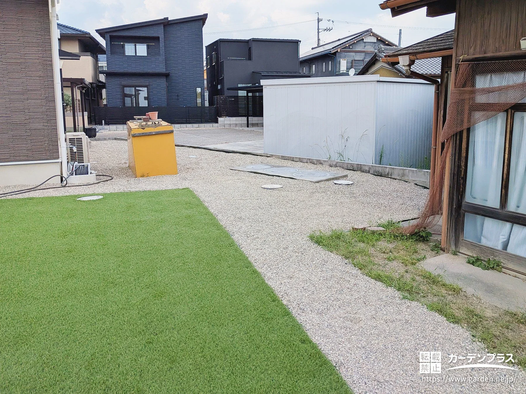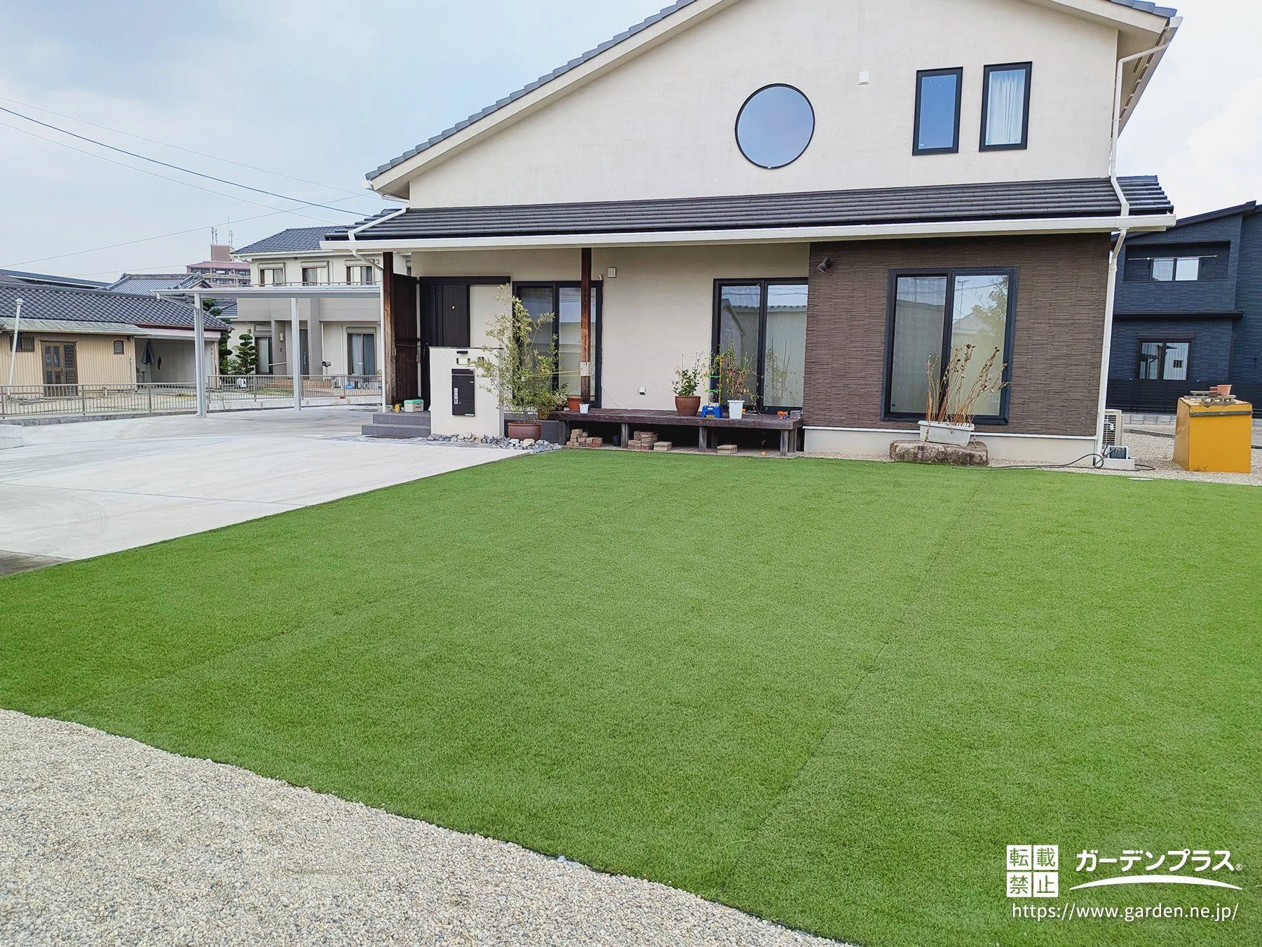 道路から緩やかに傾斜していた敷地をフラットに整え、使いやすさとコストバランスに配慮した外構リフォームです。駐車スペースは土間コンクリートで舗装し、カーポートにはエクスショップの「Value Select」シリーズを採用してコストを抑えつつ安心の強度を確保。アプローチには天然石を一部に使用し、さりげなく上質感をプラスしました。主庭は人工芝と砂利でゾーン分けし、見た目の美しさとお手入れのしやすさを両立。シンプルながらも暮らしやすく、敷地の広さとコストに配慮した外構に仕上がりました。