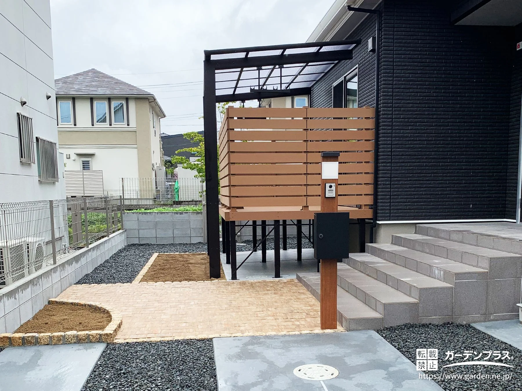 深基礎のお住まいを快適に過ごしていただけるように外構プランを設計しました。玄関までのアプローチはインターロッキングで温かみを演出し、駐車スペースはスリット入りのコンクリートでスマートに。ウッドデッキは、毎日の出入りがしやすいよう掃き出し窓の高さに合わせ、デッキフェンスで囲んで安心して過ごせるプライベート空間を確保しました。さらにテラス屋根を設け、洗濯やくつろぎの時間も快適に。全体をナチュラルブラウンとブラックでまとめ、上品で落ち着いた印象の新築外構が完成しました。