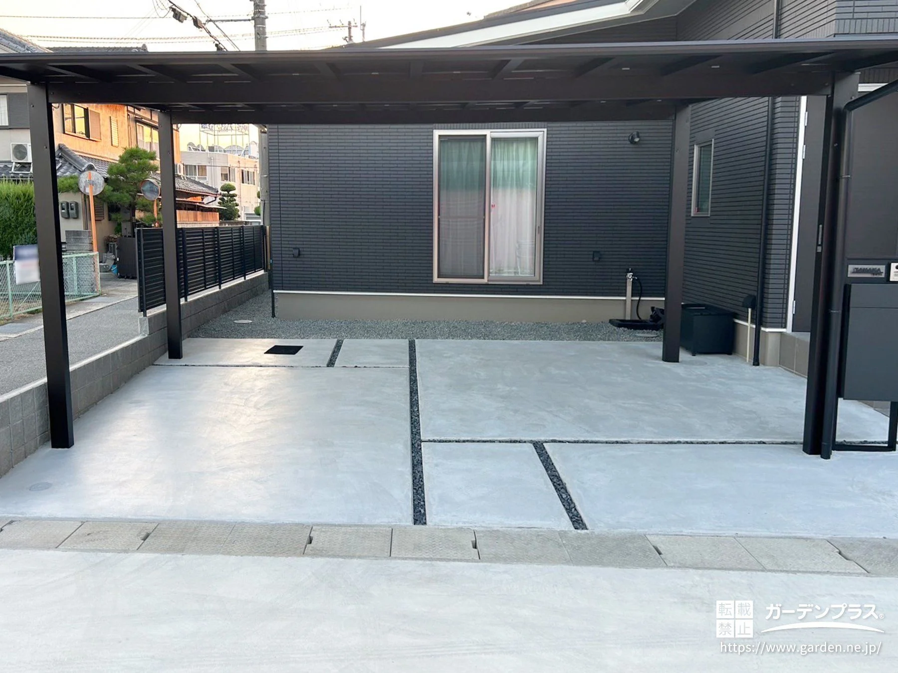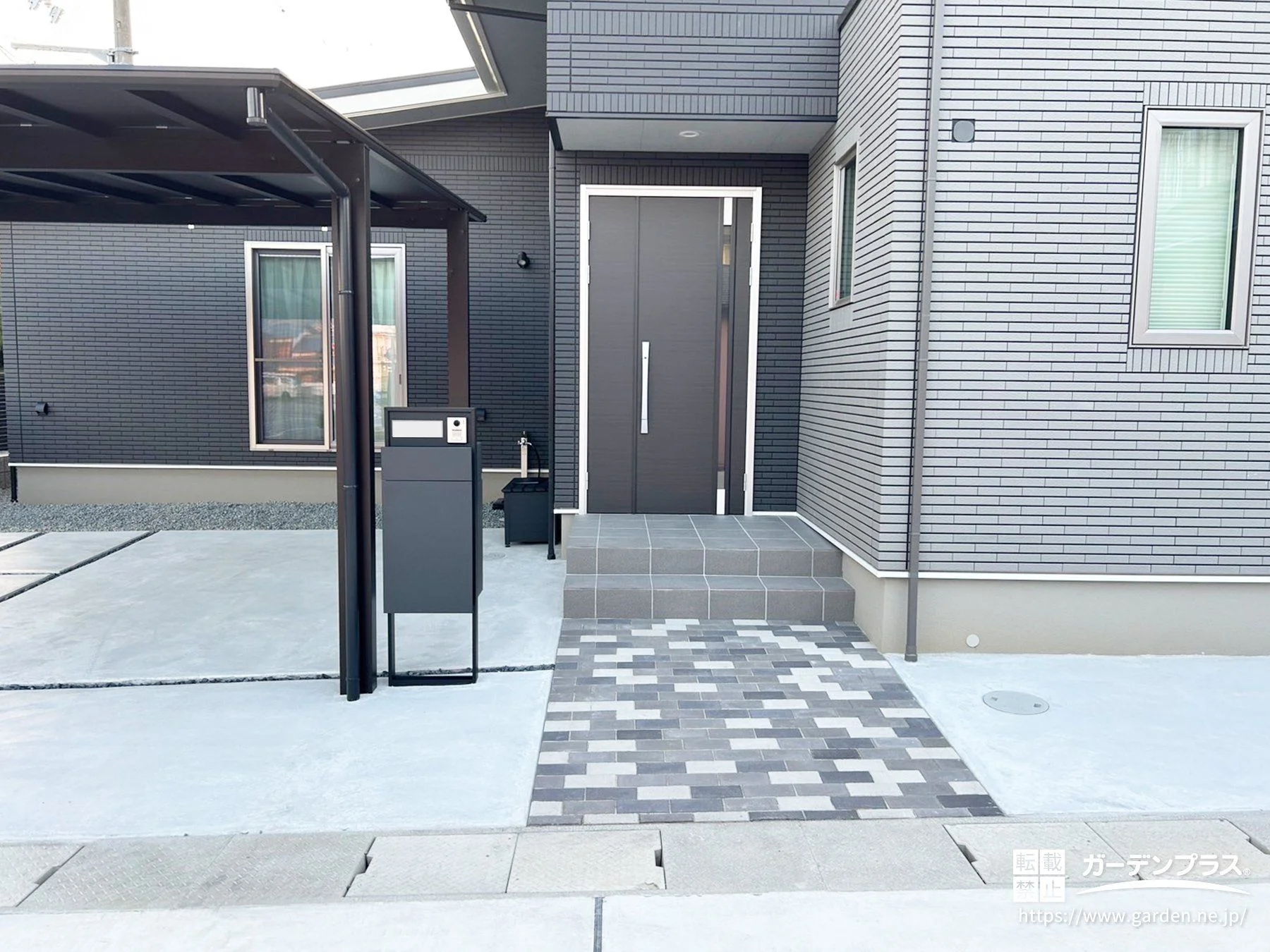 黒を基調とした住まいに合わせ、外構全体もモノトーンで統一したスタイリッシュなプランです。駐車スペースと駐輪スペースは土間コンクリートと砂利スリットでシンプルに整え、無駄のないフラットな動線を確保。建物の存在感を引き立てながら、日々の使いやすさも両立しています。ブラックポリカのカーポートは水平ラインが美しく落ち着いた雰囲気に。アプローチは濃淡グレーを組み合わせたインターロッキングで、玄関まわりに上品なリズムをつくり出しています。機能門柱は宅配ボックス一体型で、デザイン性と利便性を両立。道路沿いにはダスクグレーの目隠しフェンスと化粧ブロックが外観の重さをやわらげ、住宅全体と自然に調和するバランスのよい仕上がりになりました。家の魅力である“黒”をいかしながら、暮らしやすさを丁寧に整えた外構です。