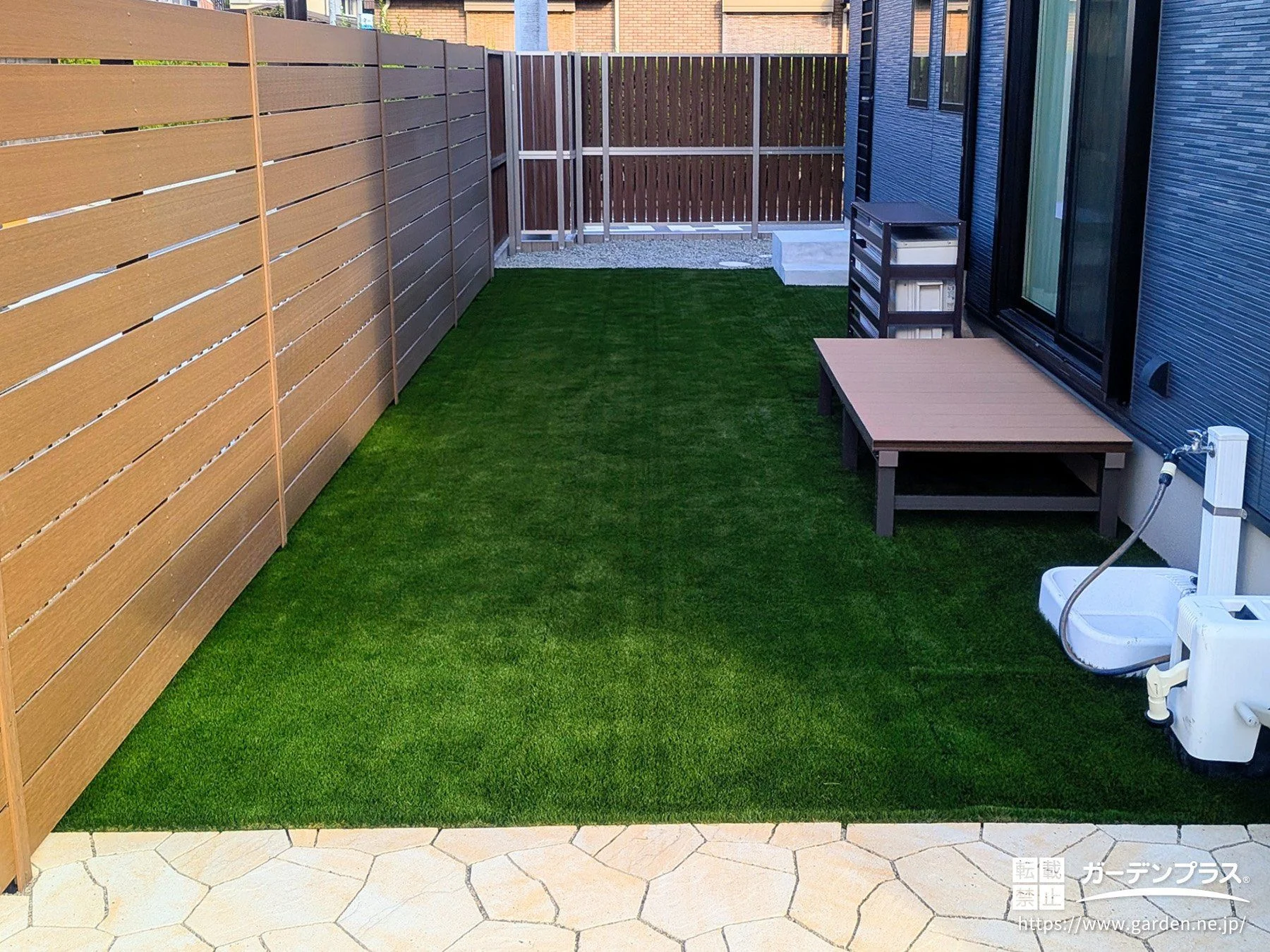 主庭に防草シートと人工芝を敷設して雑草対策を施しました。緑鮮やかで見た目にも美しく仕上がっています。また、お庭の入り口はインターロッキングで舗装。歩きやすく、高級感のある印象です。