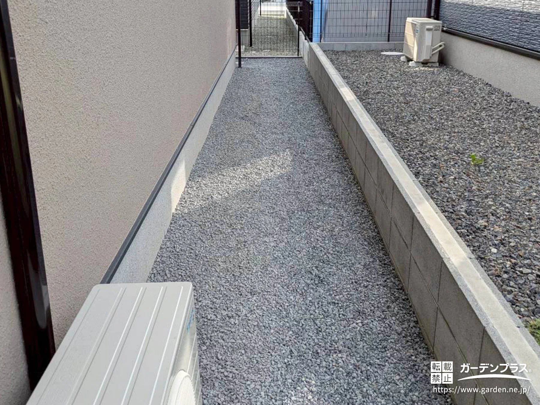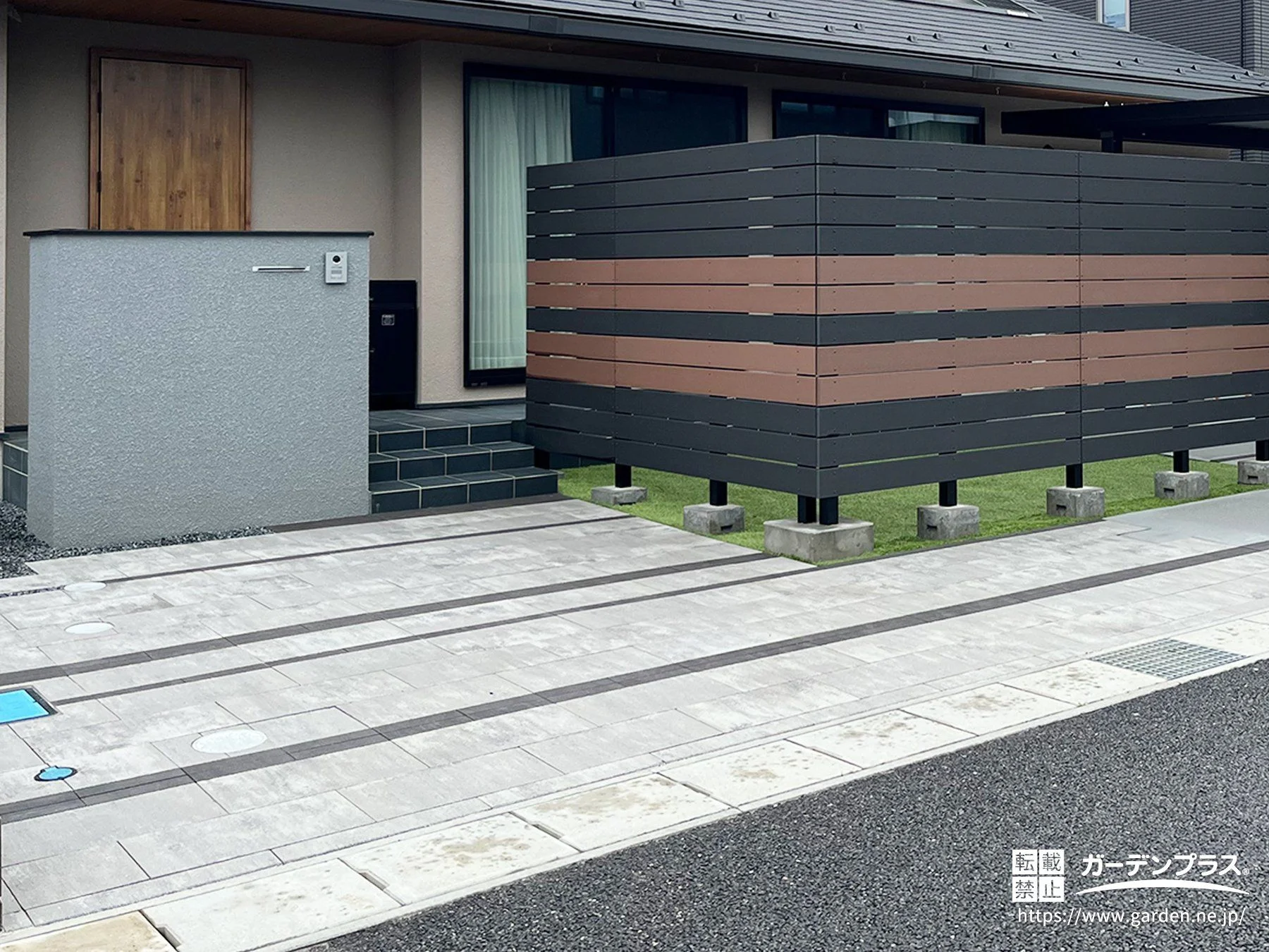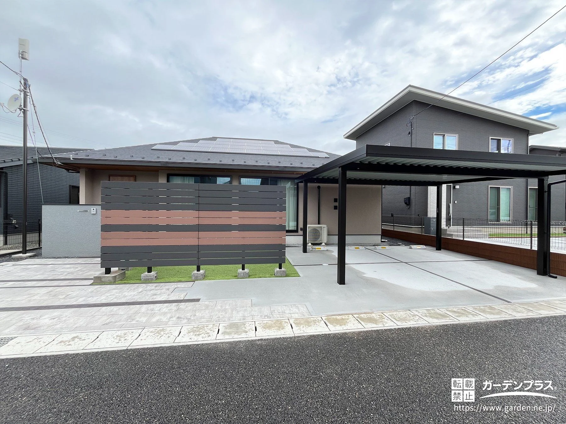新築のお住まいの外構工事を承りました。駐車スペースはコンクリート舗装にインターロッキングのラインを組み合わせ、すっきりとした印象に。カーポートを設置したことで、雨の日でも車の乗り降りが快適になり、日常の動線がぐっとスムーズになりました。道路からの視線が気になりやすいリビング前には、2色を組み合わせたフェンスを設置。程よく視線を遮りながらも圧迫感がなく、手前に広がる人工芝の庭とあわせて家族がくつろげる空間へと変わっています。また、収納力のある物置や、境界フェンス・犬走りの防草処理など、暮らしの細かな不便もしっかりカバー。お手入れがしやすく、見た目も整った外構が完成しました。