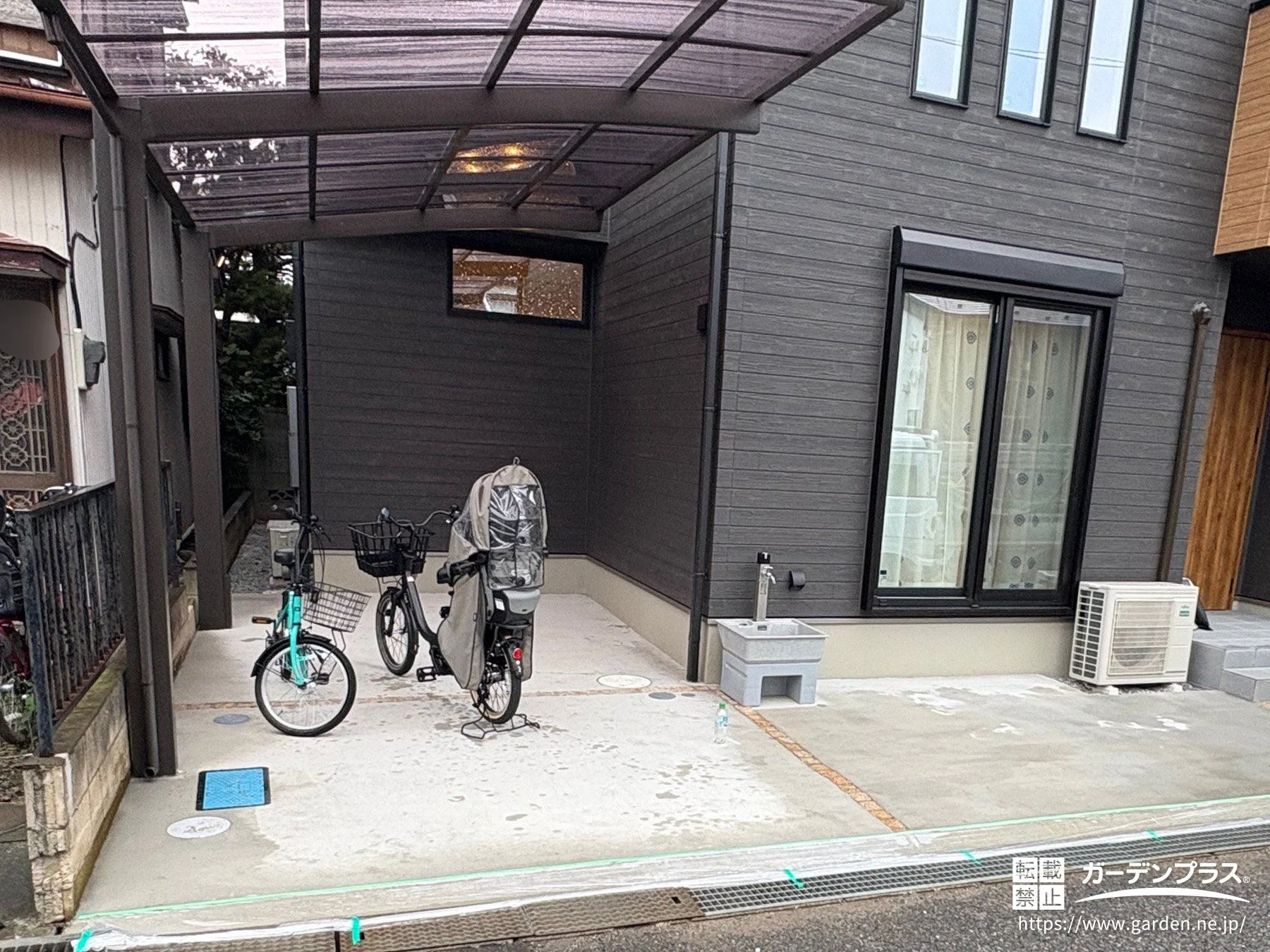 駐車スペースに土間コンクリートを打設し、平らに整えてお車の出入りをスムーズにしました。ピンコロ石の目地を入れ、可愛らしいアクセントをプラスしています。頭上には柔らかいカーブを描く屋根で優しい印象のカーポートを設置。お車を雨風から守ってくれます。