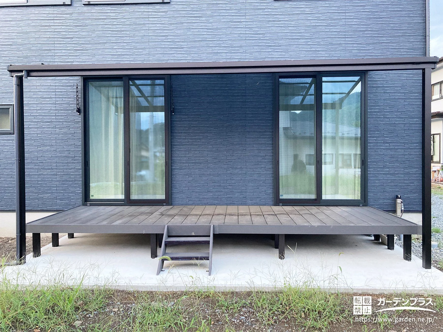 建物の落ち着いた色味に合わせて、住まいになじむグレー系のウッドデッキを計画しました。雨の日も洗濯物を干せるようテラス屋根を組み合わせました。デッキ材は日差しに強く、反りやささくれが出にくい樹脂素材を選び、小さなお子さまでも安心して過ごしていただけます。デッキ下部はコンクリート舗装にすることで雑草管理の手間をなくし、暮らしの中で“気軽に外に出られる場所”が生まれました。