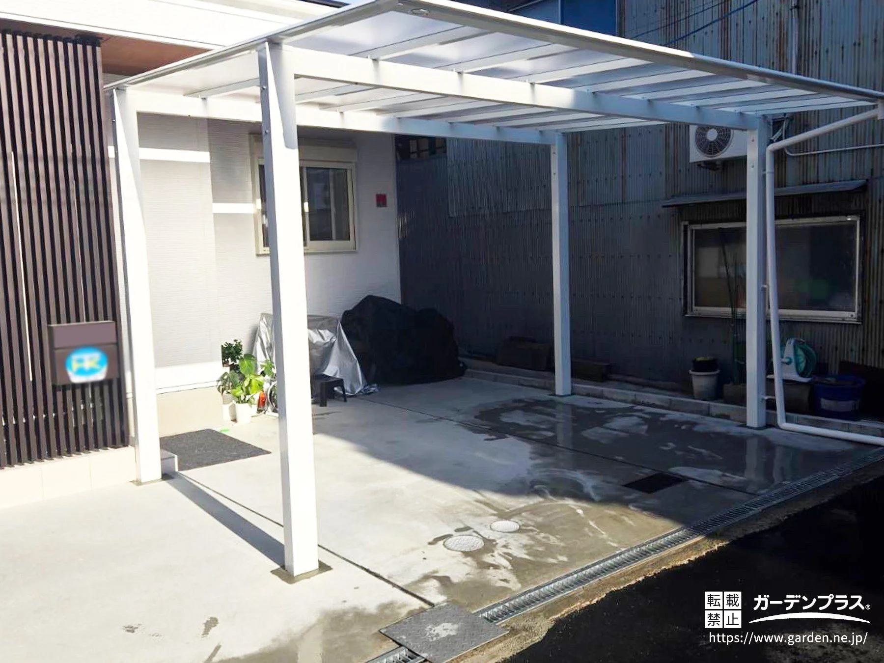 屋根が加わったことで、雨の日も濡れずに車の乗り降りができ、日々の動線がぐっと快適になりました。屋根材にはポリカーボネートを採用。採光性がありつつ直射日差しを和らげ、軽量で風にも強い素材のため、住宅まわりでも安心して使える点が魅力です。駐車スペースは土間コンクリートで整え、伸縮目地でひび割れを抑えるなど、長く心地よく使える空間に仕上がりました。