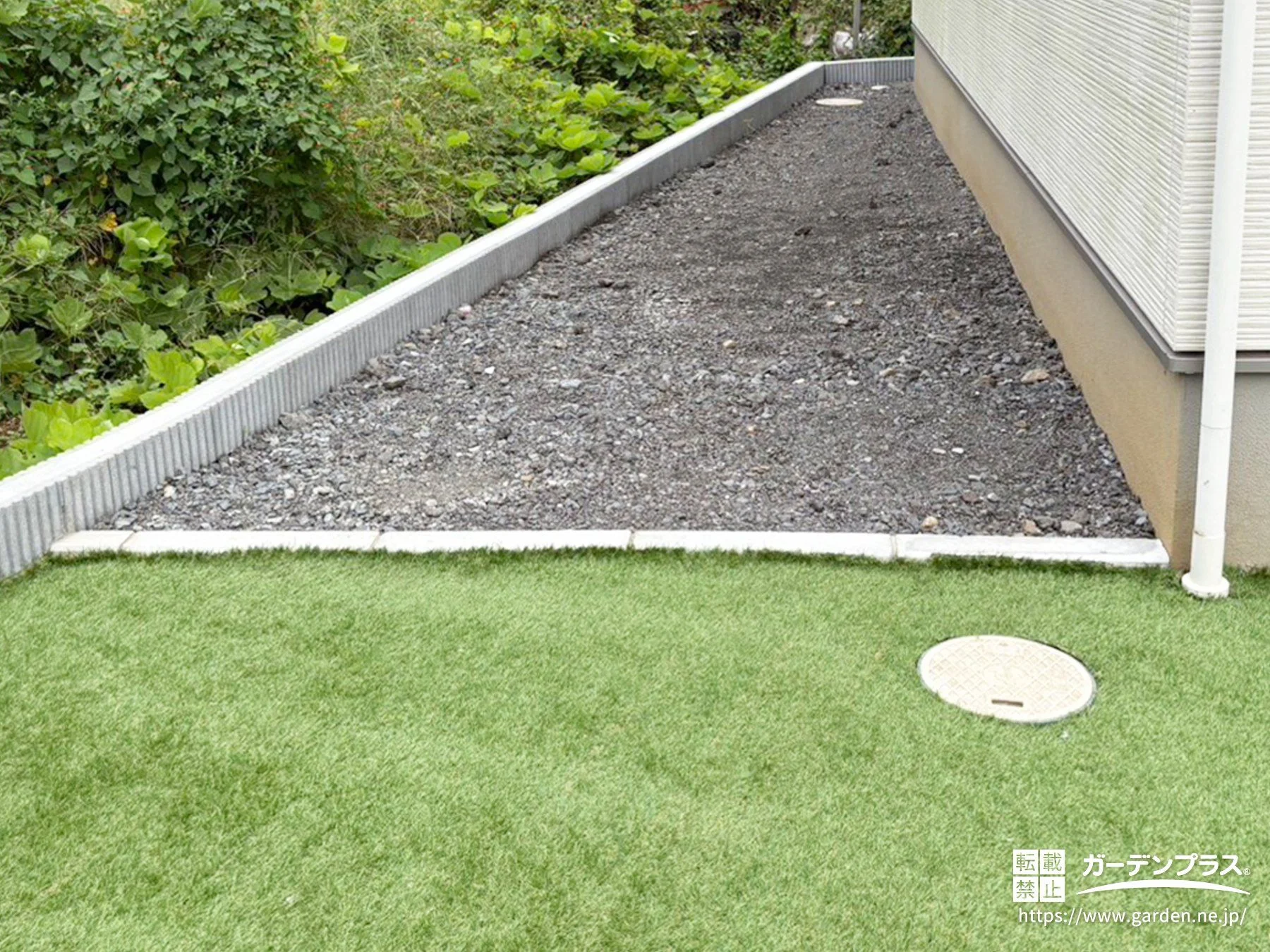 雑草が生えやすかった裏庭に防草シートと人工芝を敷き込み、年間を通して管理がしやすい空間へと整えました。ふかっとした踏み心地が心地よく、洗濯物を干すときやお子さまが外へ出る時も気軽に使える裏庭に。建物まわりの印象も明るくなり、毎日の暮らしの中で“外に出る時間”が少し楽しくなる仕上がりです。