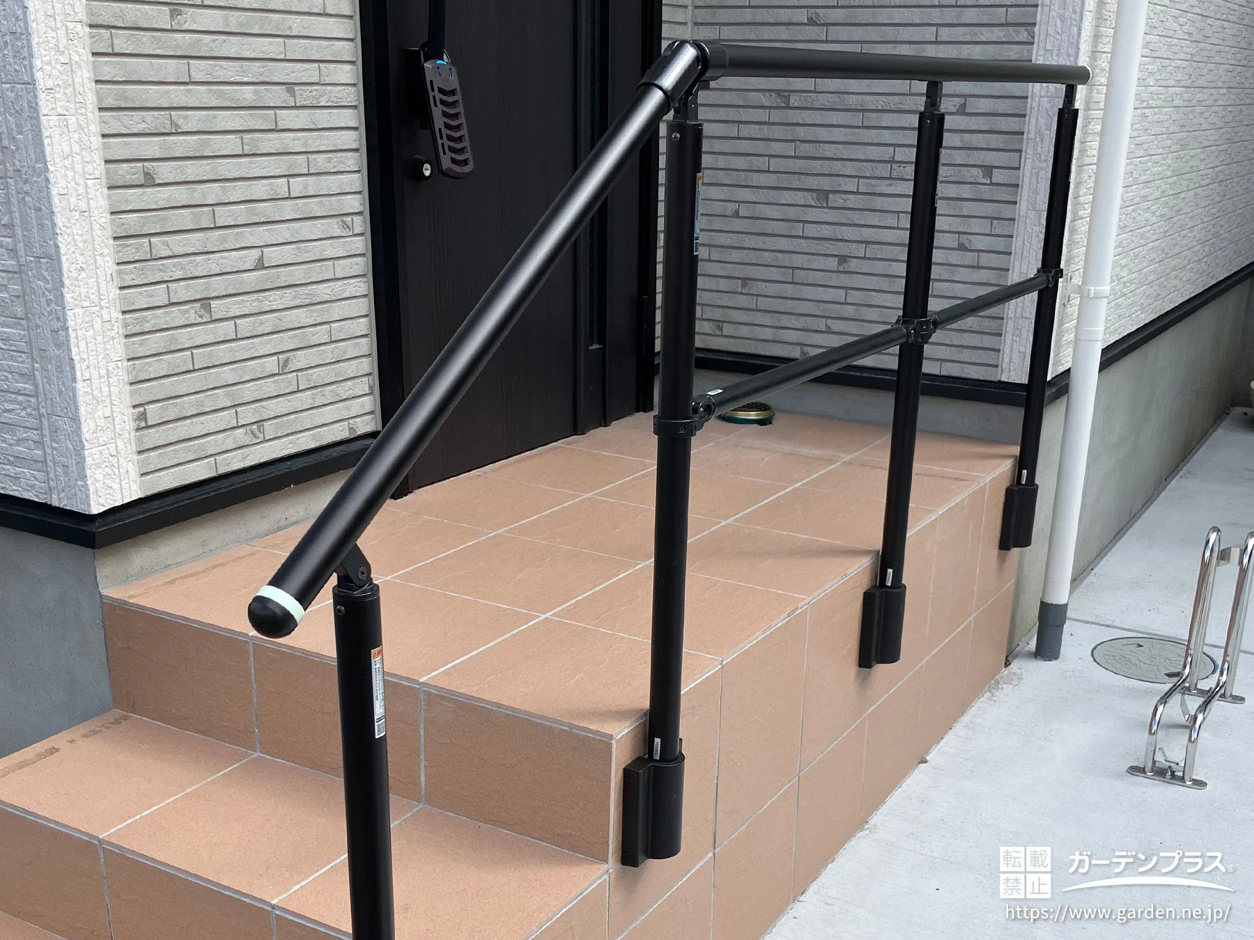 玄関ポーチに手すりを取り付けました。引き締まったカラーで外観の邪魔をせずに安全性を向上させています。どなたでも安心して上り下りできる玄関ポーチ階段の完成です。