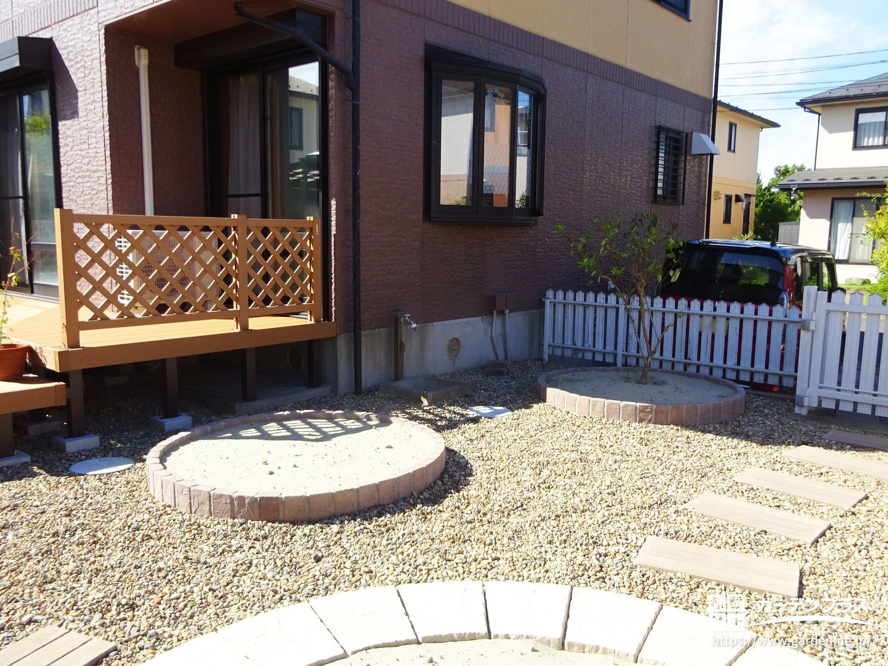 雑草に悩まされていた主庭を、防草シートと砂利敷きで手間のかからない空間へ。広々としたウッドデッキを新設し、外に出て過ごす時間がぐっと身近になりました。デッキ前には段差をおさえたステップをつくり、園路やインターロッキングテラスへ心地よくつながる動線を確保。丸く立ち上げた花壇や植栽スペースが庭全体にリズムを生み、家族で過ごすシーンが自然と広がるお庭へと生まれ変わりました。目隠しフェンスや物置も景観になじむ色で揃え、落ち着いた統一感を演出しています。