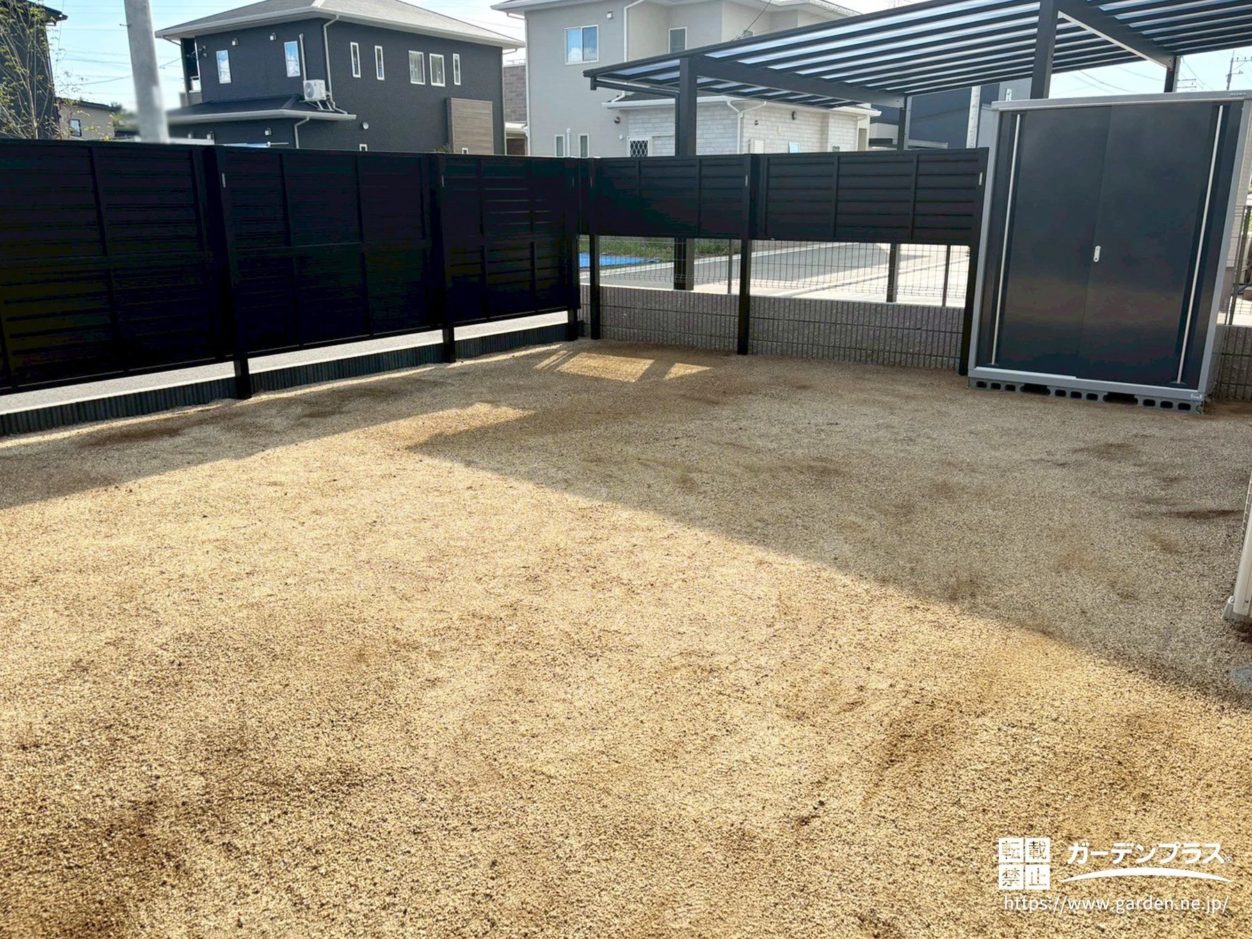 新築のお住まいに合わせ、使いやすさと外観の美しさがそろう外構一式で計画しました。駐車スペースは広めにコンクリートで舗装し、雨の日も足元が汚れにくい動線に。カーポートは建物の色調に合わせて軽やかなシルバーを選び、日差しや雨から車をしっかり守ります。玄関まわりはタイル門柱と洗い出し仕上げのアプローチで、シンプルながら目を引く上質な印象に。主庭や犬走りは管理しやすいよう山砂・砂利で整備し、目隠しフェンスでプライバシーにも配慮しています。毎日の暮らしを心地よく支える新築外構の完成です。