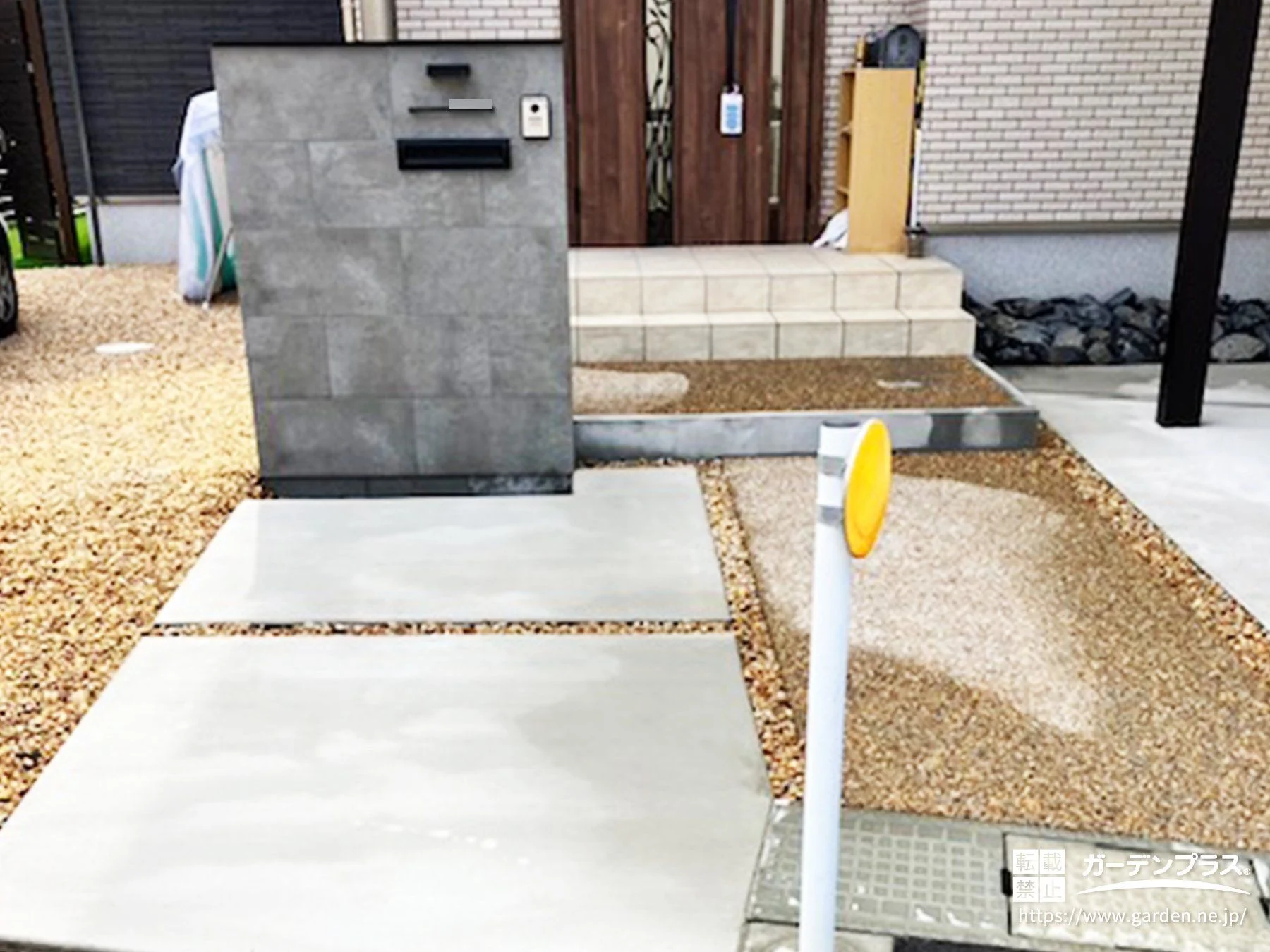 アプローチ:土間コンクリート 刷毛引き仕上げ・洗い出し仕上げ + スリット 化粧砂利