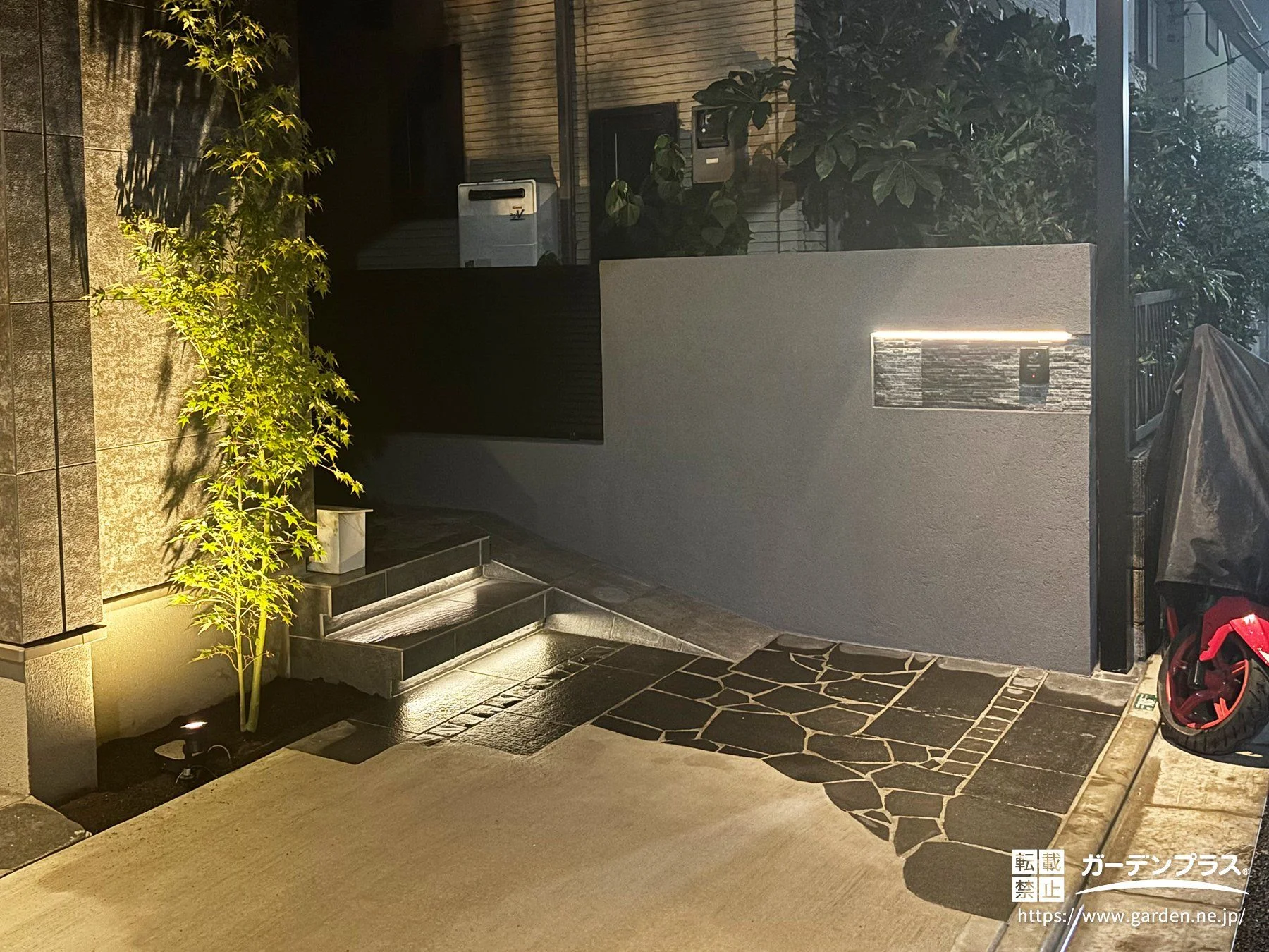 光と影が際立つ、重厚感のあるアプローチデザイン