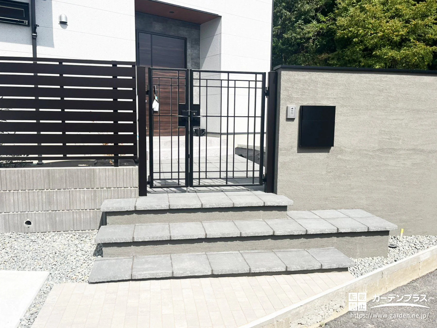 落ち着いた門まわりを演出する、グレー基調のクローズ外構
