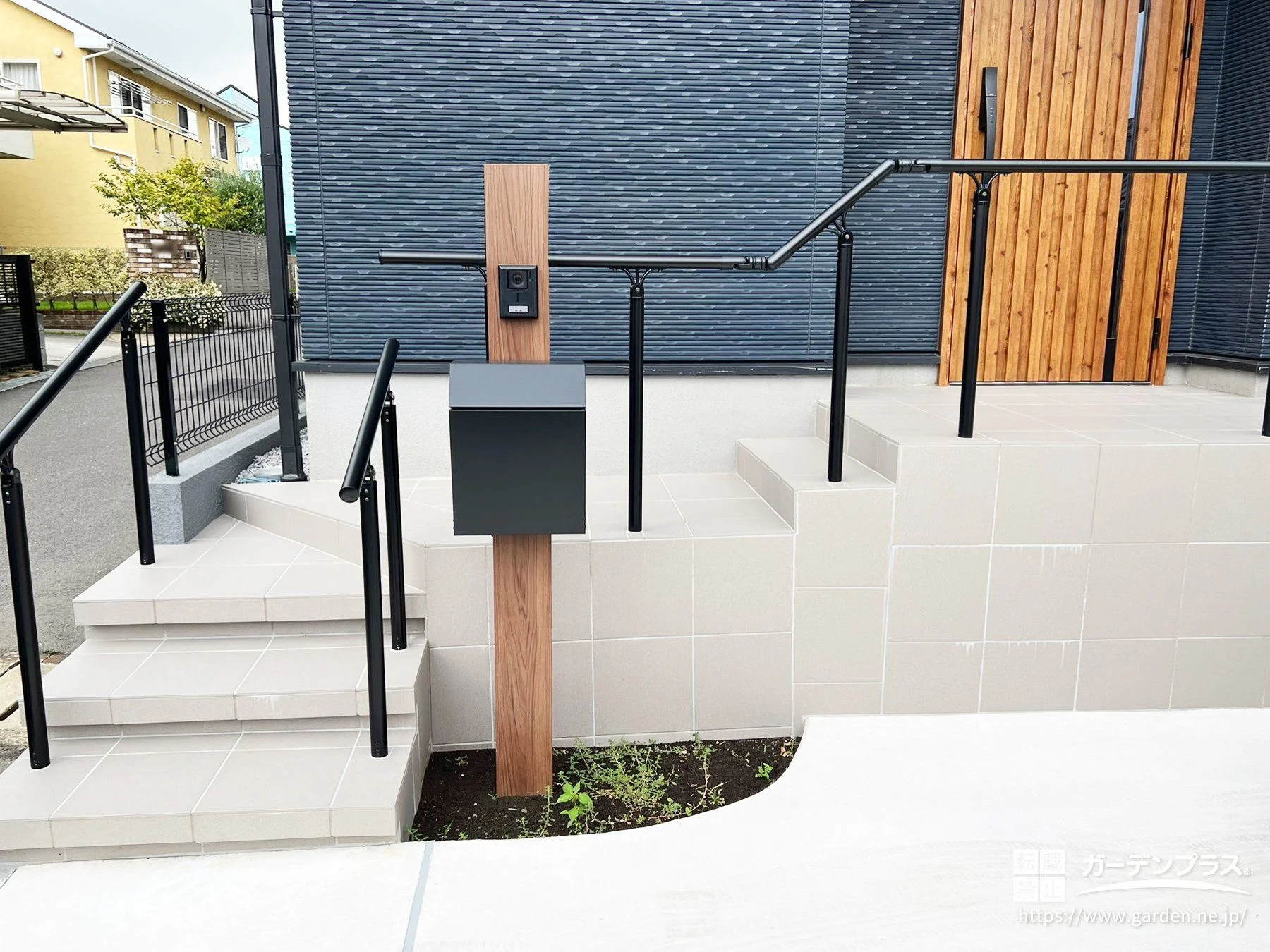 通りに面したオープンな駐車スペースは、刷毛引き仕上げの土間コンクリートで滑りにくく、毎日の出入りが安心な仕上がりに。高低差の多きな玄関ポーチは浮き階段のデザインでスタイリッシュに、手すり付きの階段を設けて安全に配慮しました。門まわりには木調の機能門柱を採用し、ブラックのポストとフェンスで全体を引き締めています。境界にはジョリパット仕上げの塀とメッシュフェンスを組み合わせ、すっきりと美しく仕上げました。シンプルながらも使い勝手の良さを追求した外構です。
