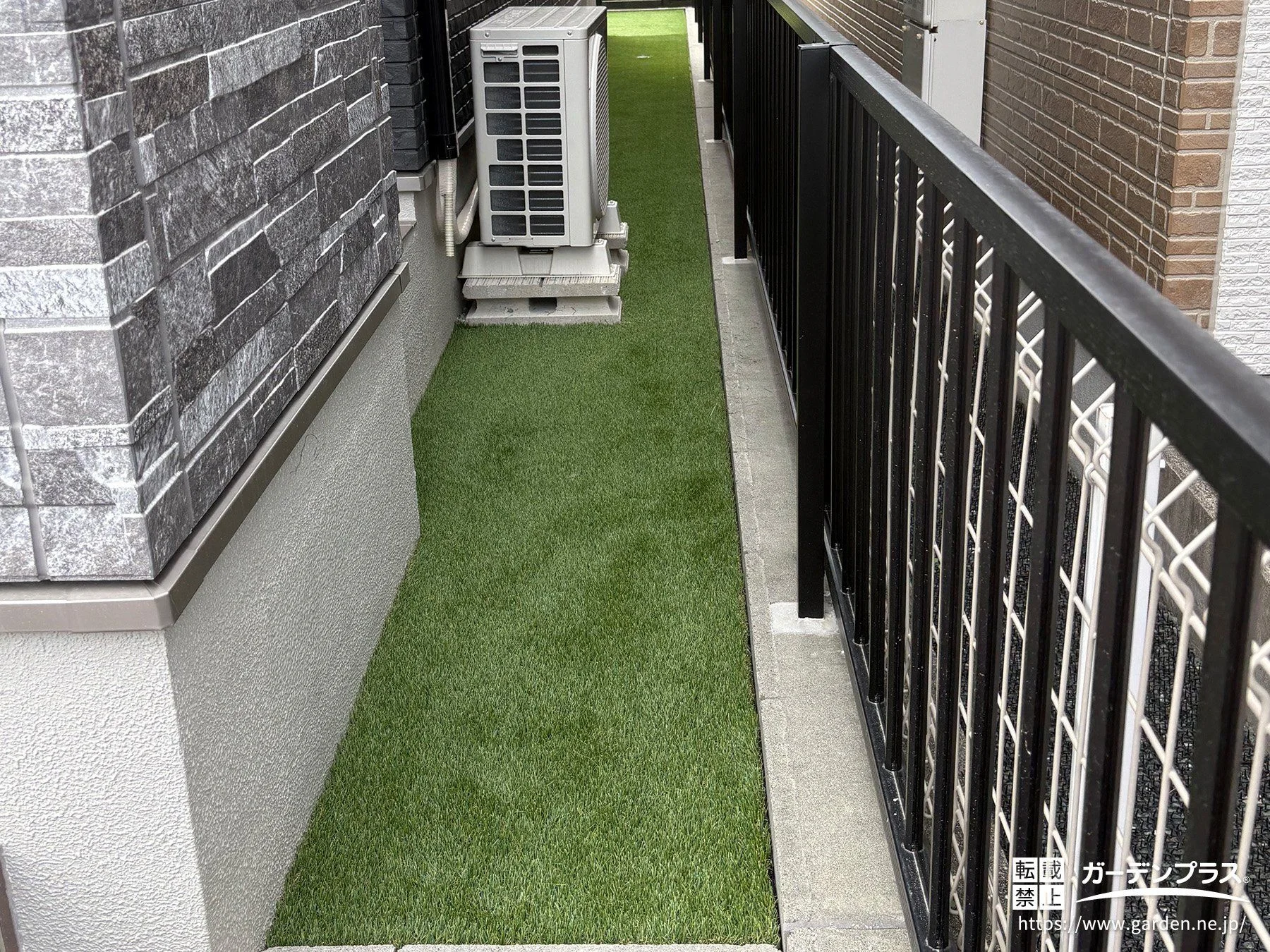 犬走りに人工芝を敷設して雑草対策を施しました。鮮やかな緑で景観も美しく整っています。