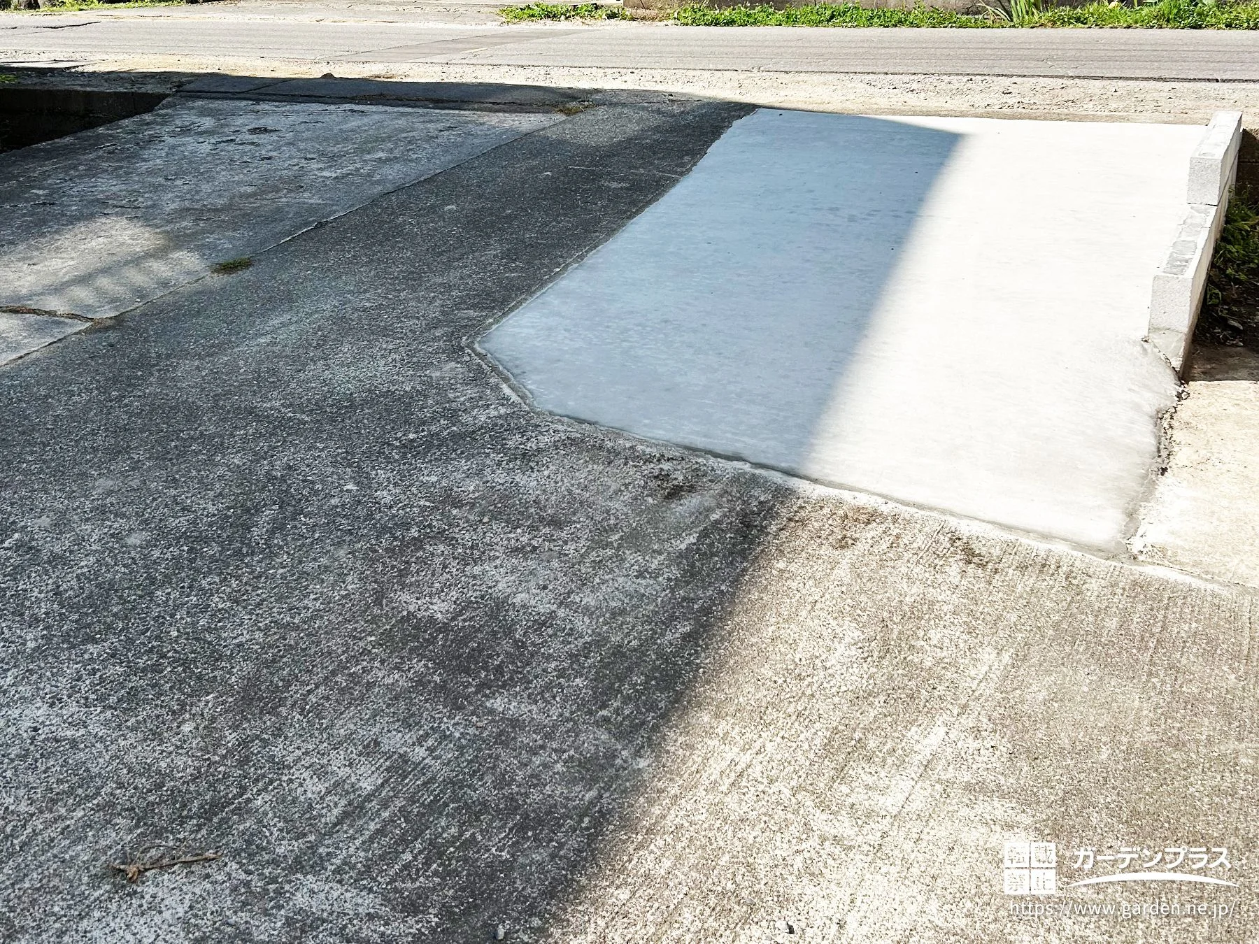 境界塀を撤去し、高低差のある箇所に、土間コンクリートでスロープを施工。車や自転車の出入りができるようになり、駐車スペースへの間口が広々利用していただけます。日々の移動がストレスなくスムーズになる、実用的な改善施工です。