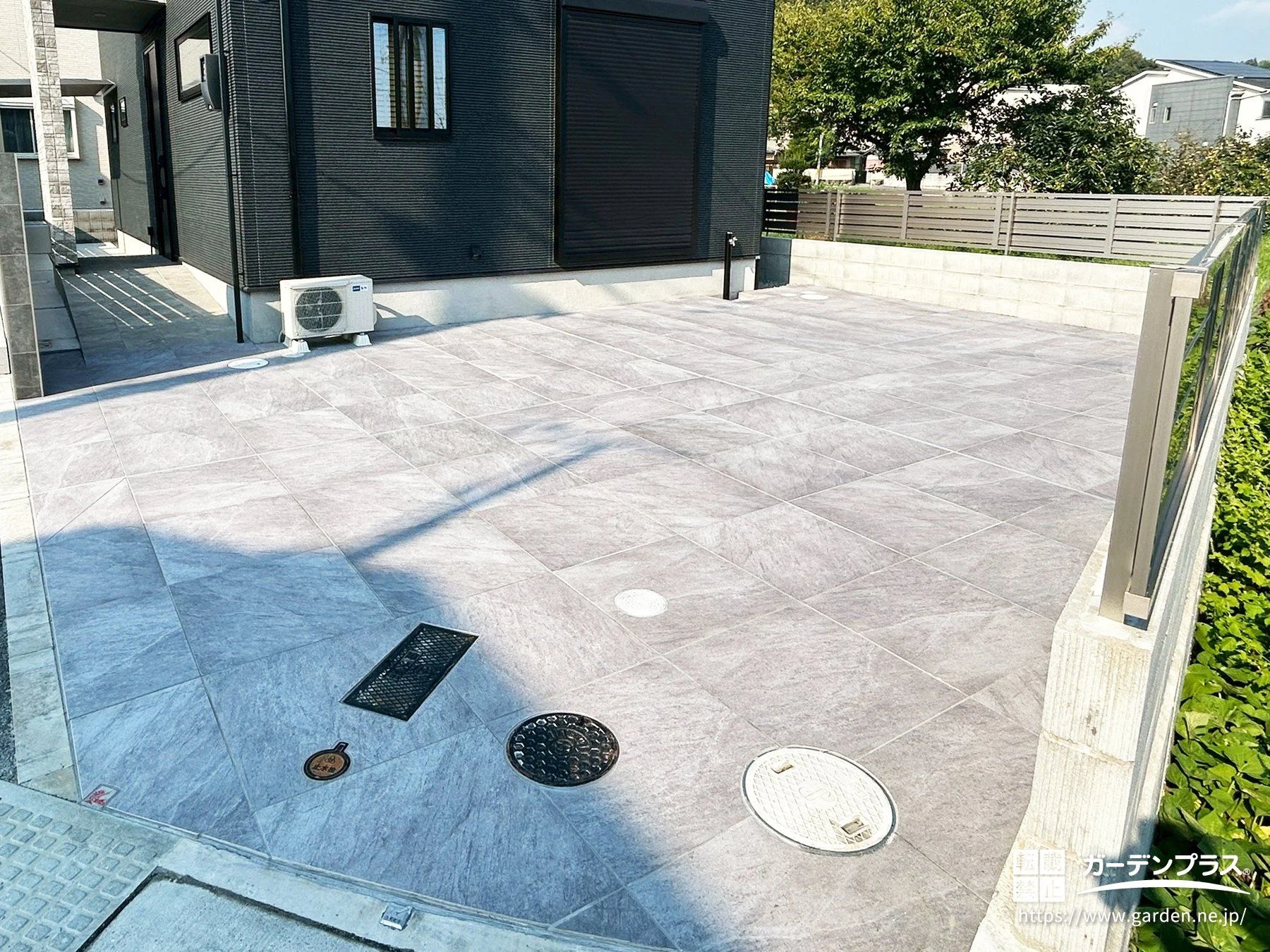 外観と調和する落ち着いたグレートーンで全体を統一し、洗練された印象に仕上げました。駐車スペースには車の乗り入れに対応したタイルを使用し、上質感とメンテナンス性を両立。門柱も同系色のタイルでまとめ、建物との一体感を演出しています。建物まわりには防草シートと砂利を敷き、雑草対策も万全。一角には屋根付きの駐輪スペースを設け、日々の使いやすさにも配慮した外構プランです。