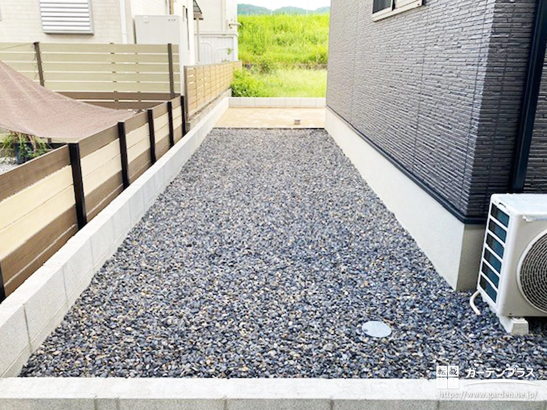 建物まわりの犬走りには防草シートと砂利を敷き、雑草が生えにくく水はけも良い管理しやすい空間に整えました。縁石でエリアをきちんと区切ることで、砂利が広がらず見た目もすっきり。雨の跳ね返りを抑えながら、外壁の汚れを防ぐ効果も期待できます。
